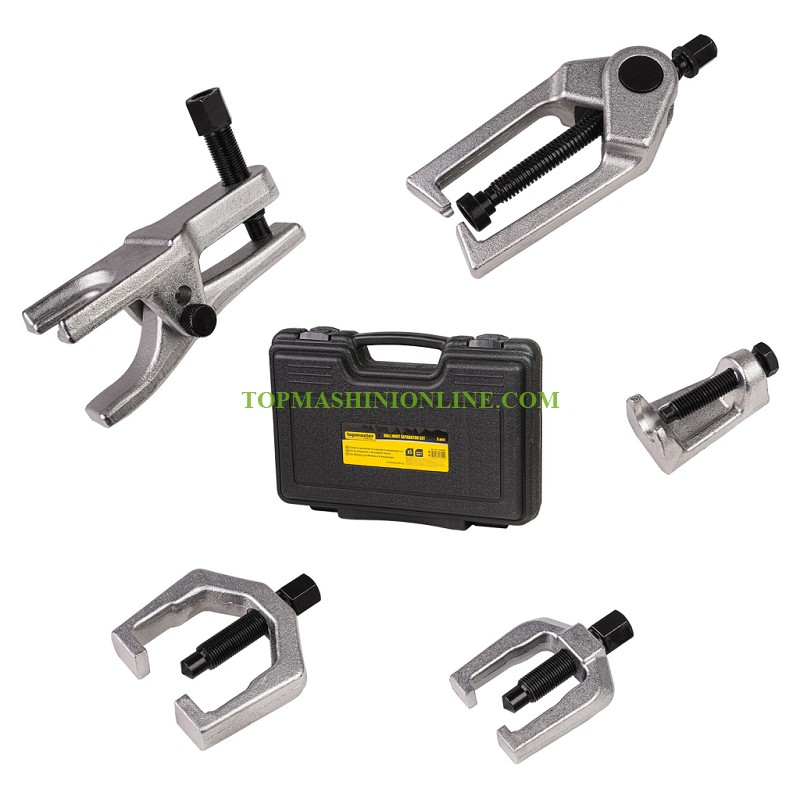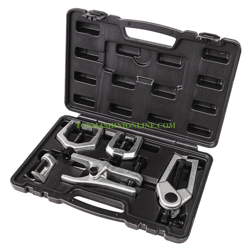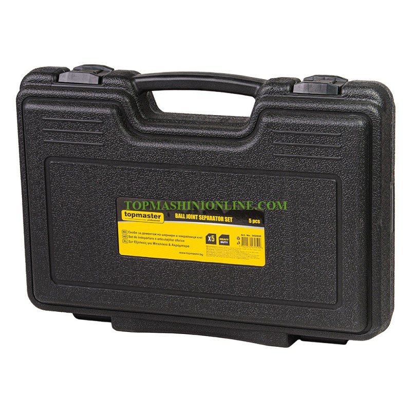 Комплект скоби за демонтаж на шарнири и накрайници Top Master Pro 342800 са изработени са от висококачествена инструментална стомана. Ергономична форма осигурява стабилно захващане и лесна работа в ограничени пространства. Благодарение на универсалният дизайн скобите са подходящ за различни типове автомобили и шарнири. Осигуряват безпроблемен демонтаж без повреждане на гумени маншони или резби. Този комплект скоби е идеален за демонтаж на шарнири, кормилни накрайници, шарнирни връзки и елементи на предно и задно окачване. Доставят се в здрав транспортен куфар, осигуряващ лесно съхранение и безопасно пренасяне.