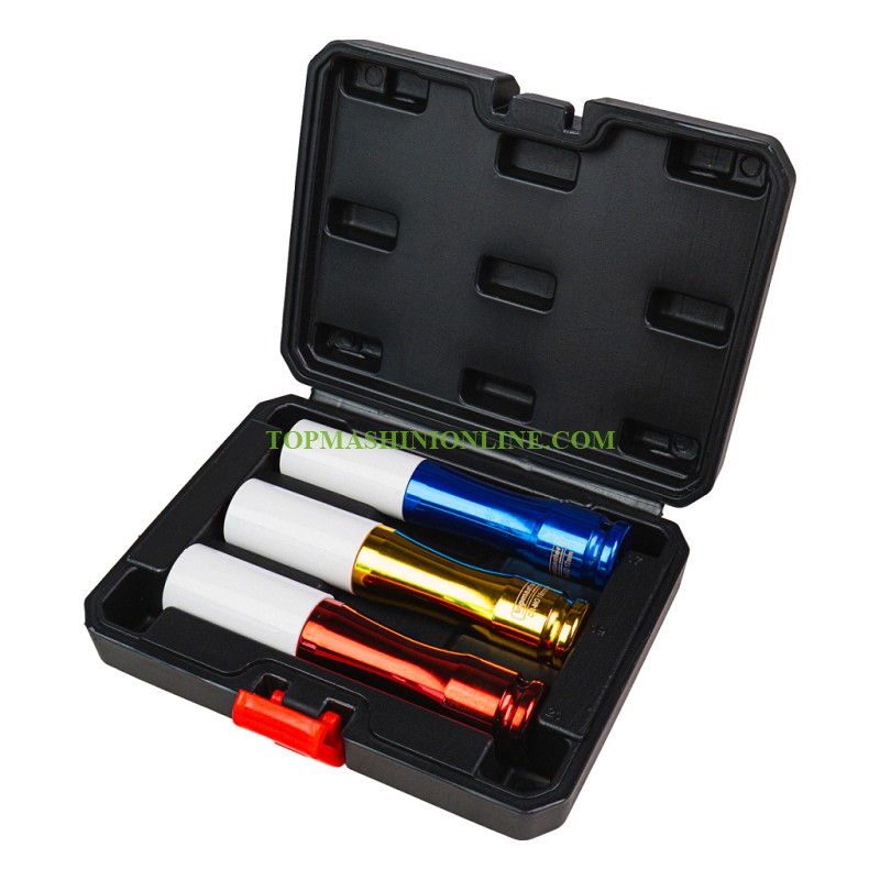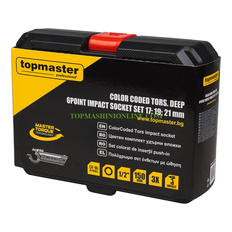 Комплектът тефлоново покрити цветни торсионни удължени ударни вложки Top Master 338808 включва три от най-често използваните размери – 17 мм, 19 мм и 21 мм, което го прави практично решение за автомобилни ремонти, монтажни дейности и сервизни приложения. Вложките са изработени от висококачествена хром-молибденова стомана (Cr-Mo), която осигурява отлична устойчивост на удар, усукване и износване. Това гарантира дълъг експлоатационен живот дори при интензивна работа. Допълнителното тефлоново покритие предпазва обработваните повърхности от надраскване, което е особено важно при работа с алуминиеви джанти и декоративни елементи. Освен това покритието повишава устойчивостта на корозия и износване.С дължина от 150 мм, вложките осигуряват лесен достъп до дълбоко разположени или труднодостъпни болтове, улеснявайки работата в тесни пространства. Шестостенният (6-стенен) профил гарантира максимално стабилен захват върху гайки и болтове, като намалява риска от приплъзване и повреждане. Комплектът разполага с цветово кодиране в жълто, синьо и червено, което позволява бързо и лесно разпознаване на размера по време на работа. Всички вложки са подредени в компактно и здраво куфарче, осигуряващо удобство при съхранение и транспортиране.