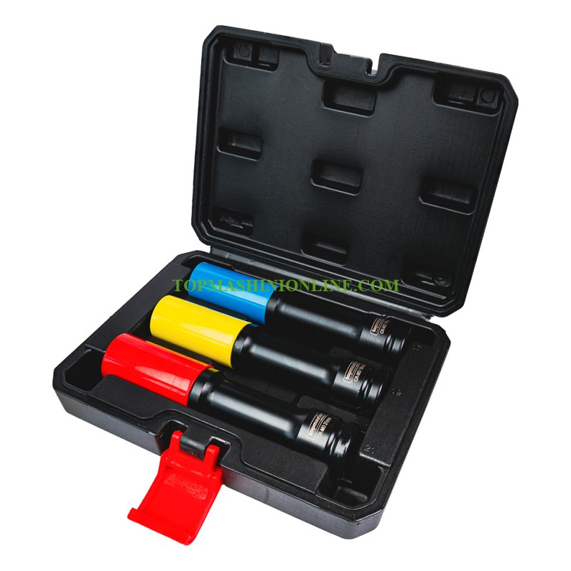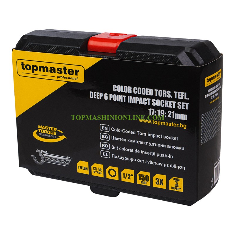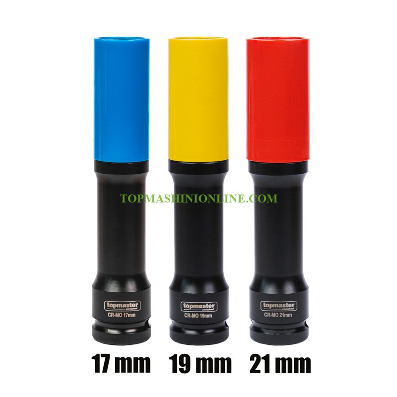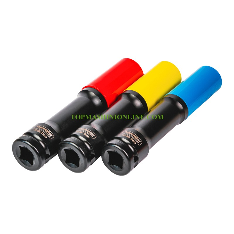 Комплектът цветни удължени ударни вложки Top Master 338807 включва три от най-често използваните размери – 17 мм, 19 мм и 21 мм, което го прави изключително практичен избор за автомобилни ремонти, монтажни дейности и сервизна работа. Вложките са изработени от висококачествена хром-молибденова стомана (Cr-Mo), която се отличава с отлична устойчивост на удар, усукване и износване. Това гарантира дълъг експлоатационен живот дори при интензивно натоварване. С дължина от 150 мм, вложките осигуряват лесен достъп до дълбоко разположени или труднодостъпни болтове, като значително улесняват работата в тесни пространства. Шестостенният (6-стенен) профил осигурява максимално стабилен захват върху гайките и болтовете, като намалява риска от превъртане и повреждане на крепежните елементи. Комплектът се отличава и с удобно цветово кодиране – червено, синьо и златно, което позволява бързо разпознаване на размера по време на работа и повишава ефективността. Подредени са в компактно и здраво куфарче, което осигурява удобство при съхранение и транспортиране.