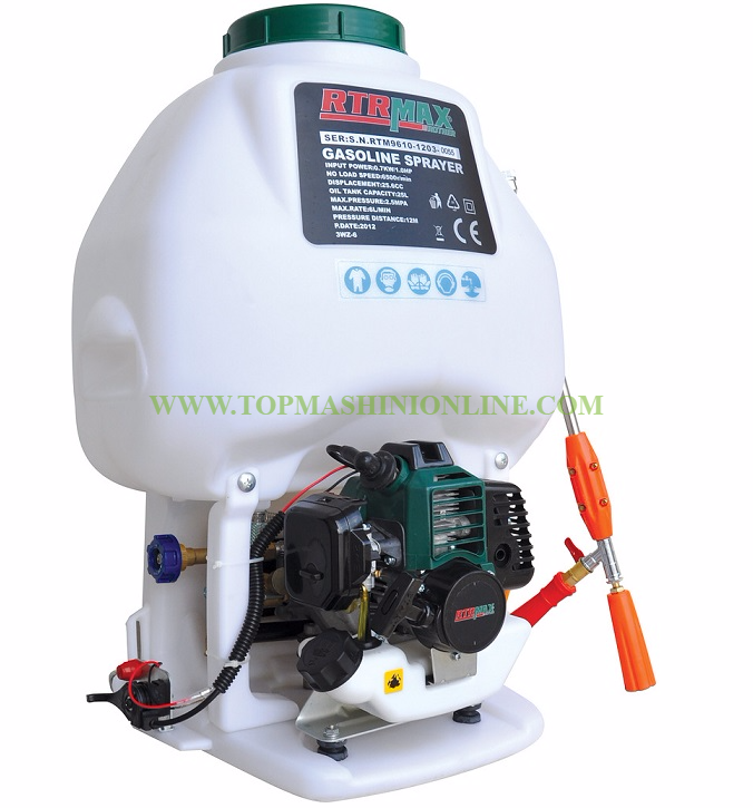 Моторна пръскачка RTR MAX RTM9610 се използва за разпръскване на различни течности както и такива в гранулирана форма. Пръскачка моторна RTR MAX RTM9610 е с обем на резервоара 25 литра, хоризонтално впръскване 12 метра и вертикално впръскване 9 м. Разпръсквач с 1 и разпръсквач с 3 регулируеми накрайника.
