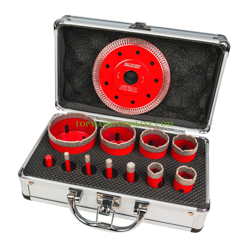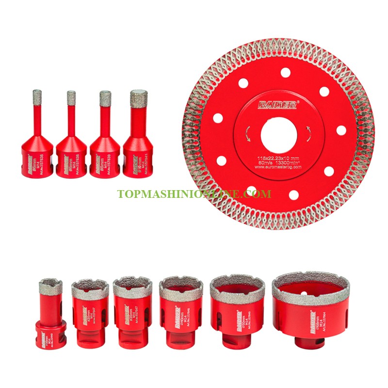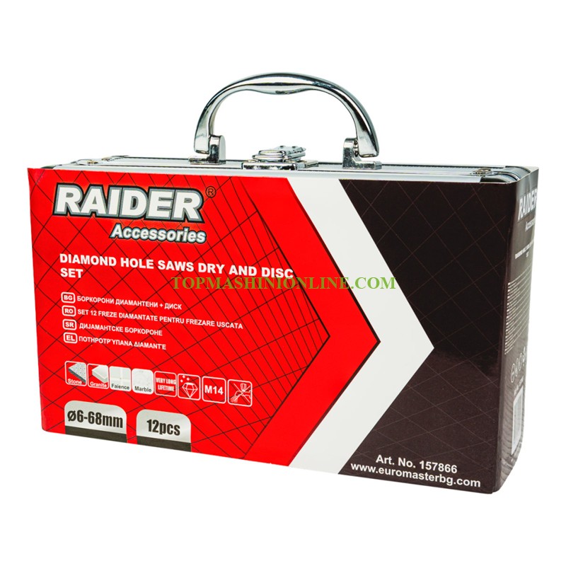 Комплектът боркорони и диск за ъглошлайф Raider 157866 е създаден за прецизно и ефективно пробиване в твърди строителни материали. Подходящ както за професионалисти, така и за любители, той осигурява надеждност, дълъг експлоатационен живот и отлични резултати при работа. Боркороните са с висококачествено диамантено покритие, което гарантира изключителна издръжливост и бързо проникване в твърди повърхности като керамика, гранитогрес, мрамор и бетон. Тази технология значително намалява износването и повишава ефективността при пробиване. Комплектът включва боркорони с различни диаметри – от 6 mm до 68 mm, което осигурява голяма гъвкавост и възможност за изпълнение на разнообразни задачи – от малки прецизни отвори до по-големи монтажни отвори. Всички боркорони са снабдени със стандартна M14 резба, което ги прави напълно съвместими с повечето ъглошлайфи и гарантира лесен и бърз монтаж. В комплекта е включен и адаптер от HEX към M14, който разширява съвместимостта и позволява използване с бормашини и винтоверти. Комплектът е допълнен с диск и се предлага в здрав алуминиев куфар, който осигурява удобство при съхранение и транспортиране, както и защита на инструментите.