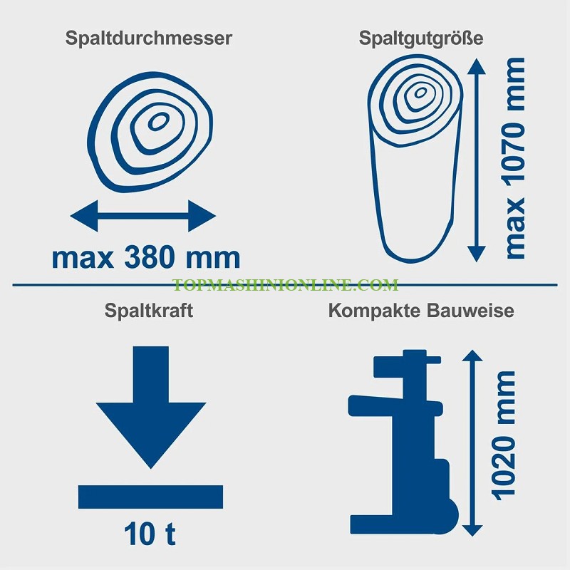 Вертикална трифазна цепачка за дърва 10 тона Compact 10tс мощния си 3500 W двигател и сила на цепене от 10 тона, цепи трупи с дължина до 1070 мм и диаметър от 80 до 380 мм. Дори суха твърда дървесина може да се цепи без усилие. За да предпази гърба ви, машината е оборудвана с повдигач на трупи, който изправя тежките трупи, позволявайки лесното им поставяне върху ниската основна плоча. Големият клин за цепене цепи без усилие както твърда, така и мека дървесина. Благодарение на системата за цепене Vario, различните размери на трупите не са проблем. Машината за цепене на дърва Scheppach изисква 400-волтова електрическа връзка за работа, което я прави особено мощна. При работа с тежко оборудване, максималната безопасност на потребителя е от първостепенно значение: цепачката е изработена от устойчива на усукване стоманена конструкция с прахово покритие и е оборудвана със скоба за трупи и задържащ механизъм. Машината може да се управлява само с две ръце. Следователно, тази сертифицирана по GS машина за цепене на дърва, отговаря на настоящите стандарти за безопасност. Благодарение на компактния дизайн и височина само 102 см в прибрано състояние машината е особено лесна за съхранение. Тегло от 134 кг и вградено устройство против преобръщане гарантират, че машината винаги стои стабилно. Благодарение на двете си големи транспортни колела, Compact 10t е лесен за преместване.