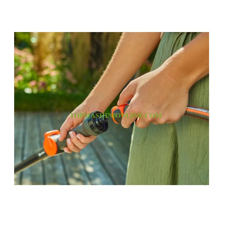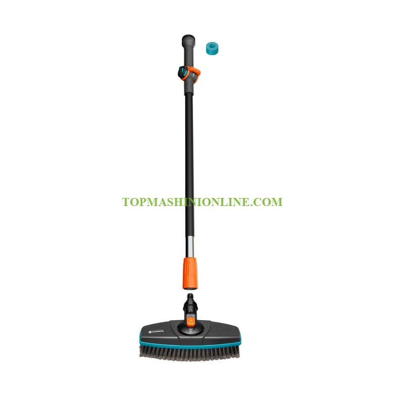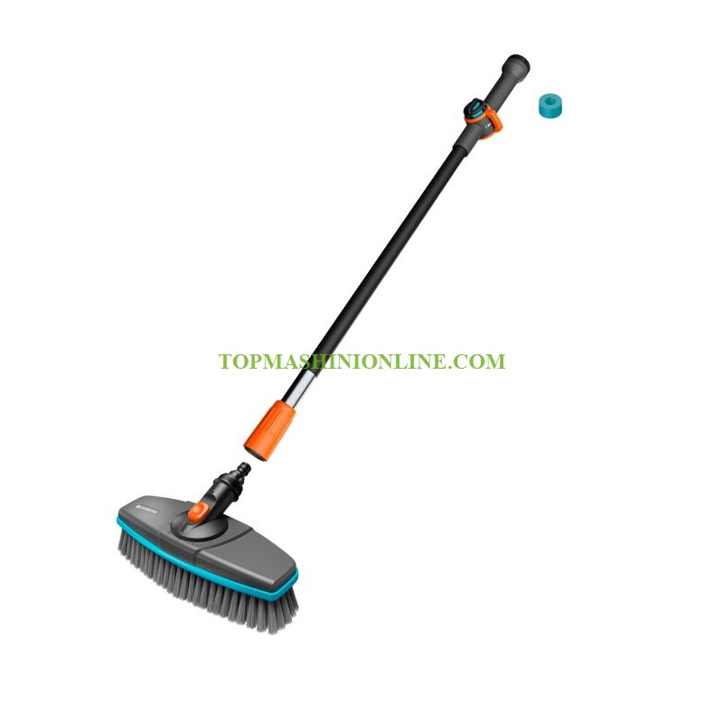 Комплект за миене на коли Gardena 18826-20 включва четка за измиване, дръжка за течаща вода и почистващи таблетки. С дължина на дръжката от 90 см, четката е идеална за достигане до вертикални зони, като например оранжерии. За да бъде работата възможно най-комфортна, дръжката е изработена от висококачествен, здрав алуминий и е покрита, за да не е студена на допир, дори когато навън е студено. Дебитът на водата може да се регулира според нуждите чрез безстепенно регулиране. След като се свърже с градинския маркуч с една лесна стъпка, подаването на вода може да се регулира напълно и да се спре от дръжката. Почистващите таблетки също се поставят директно в смесителното устройство на дръжката. Сапунът и водата се нанасят върху повърхността в оптимални дози. Дозаторът е прозрачен, което ви позволява веднага да видите колко таблетките вече са се разтворили. Едно просто „щракване“ е необходимо, за да свържете градинския маркуч към дръжката. Четката за почистване се закрепва към края на дръжката с помощта на винтова връзка, след което почистващата таблетка се поставя в смесителния блок на дръжката. Специално разработените меки влакна на четката позволяват нежно и цялостно почистване на чувствителни повърхности. Главата на четката може да се завърта на 360° на стъпки от 30° във всички посоки, което позволява идеалното ѝ адаптиране към почистваната повърхност. Благодарение на меката пластмасова отливка по целия периметър на главата на четката, тя не оставя никакви драскотини.