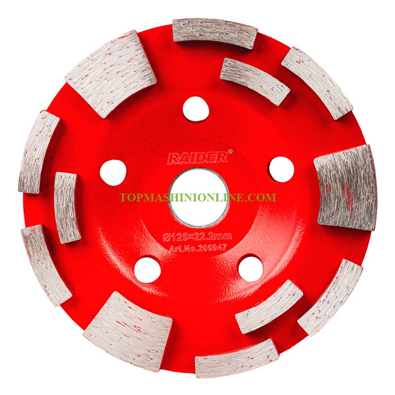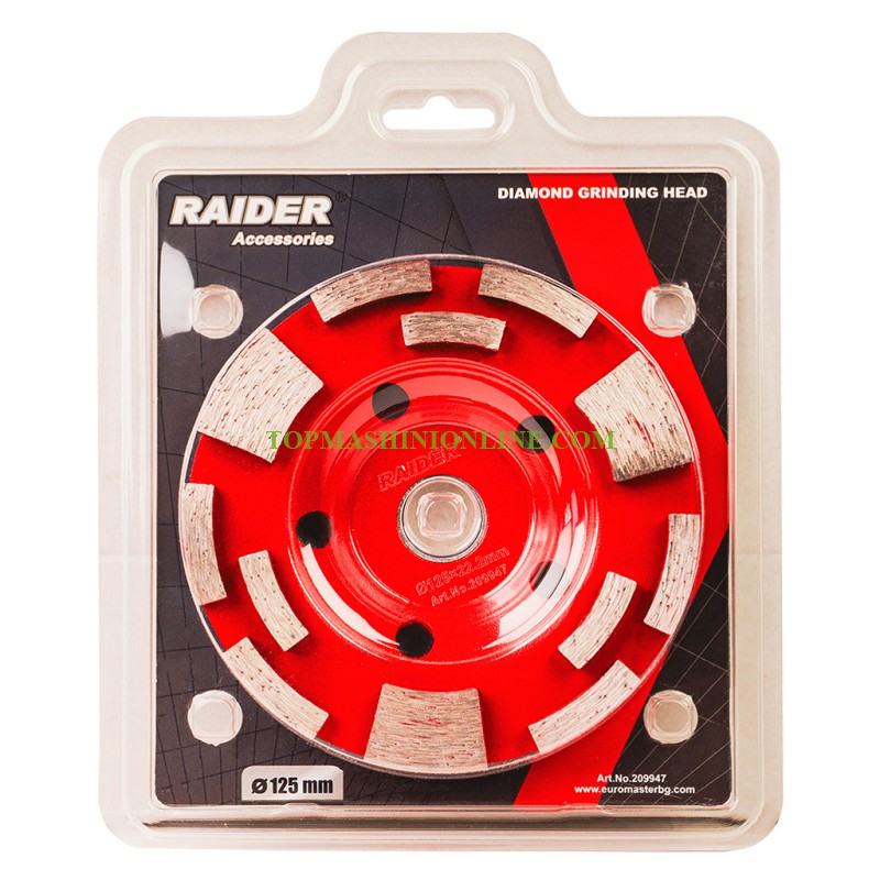 Диск диамантен за шлайфане върху бетон Raider с външен диаметър 125 мм, вътрешен диаметър 22.2 мм е подходящ за сухо шлайфиране на бетон, керамични плочки, мрамор, зидария, гранит и други строителни материали – както гладки, така и неравни повърхности. Двойният ред сегменти на комбинирания диамантен шлифовъчен диск осигуряват бързо отстраняване на покрития и високоефективно шлайфане с гладък завършек. Оптималният баланс на сегментите позволява работа без вибрации.