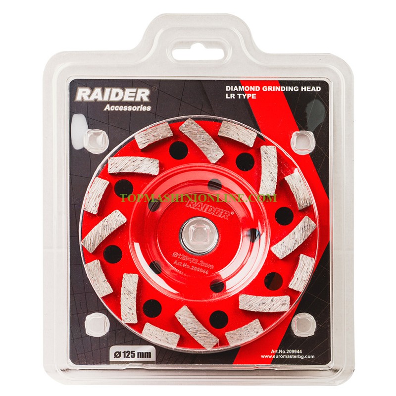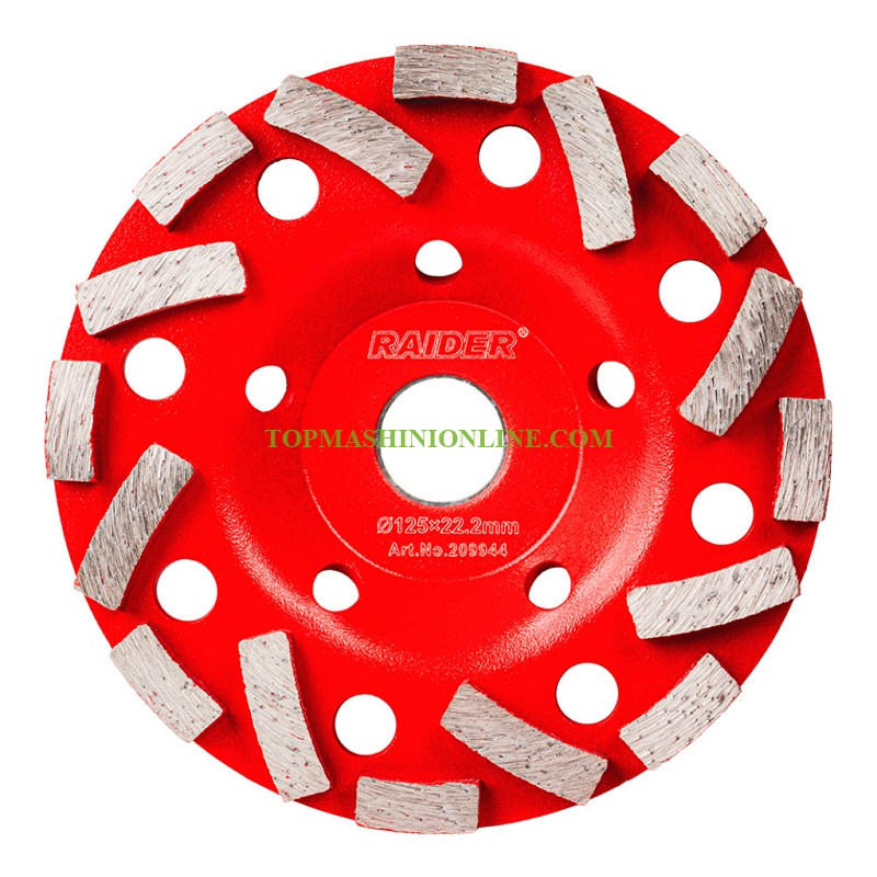 Диск диамантен за шлайфане на бетон Raider 209944 с външен диаметър 125 мм, вътрешен диаметър 22.2 мм е подходящ за сухо шлифоване на керамични плочи, мрамор, бетон, зидария, гранит и други строителни материали, както гладки, така и неравни повърхности. Двойният ред от 16 сегмента осигурява висока устойчивост, бързина и равномерно шлифоване. Комбинира по-висока работна скорост с идеална равномерност. Гарантира продължителна издръжливост при обработка на бетон. Сегментната конструкция позволява по-ефективно охлаждане и предпазва от прегряване.