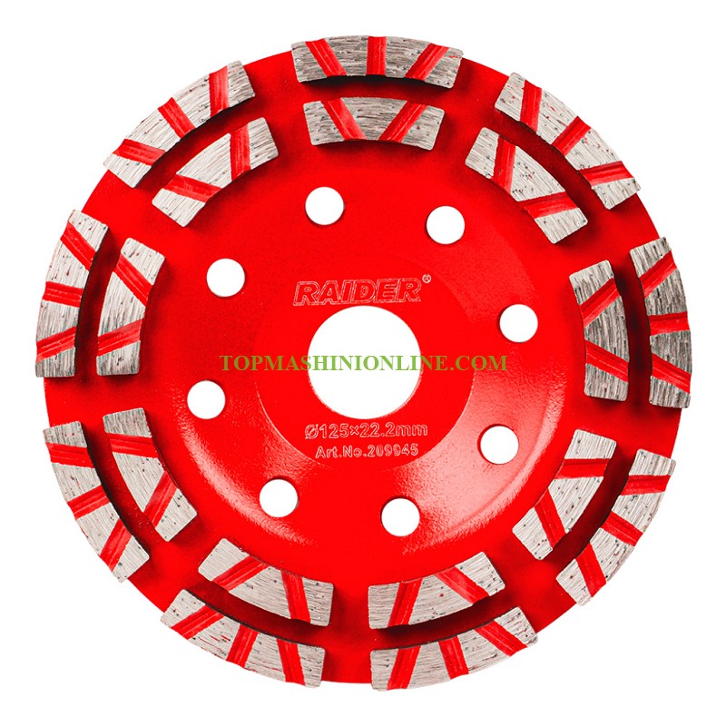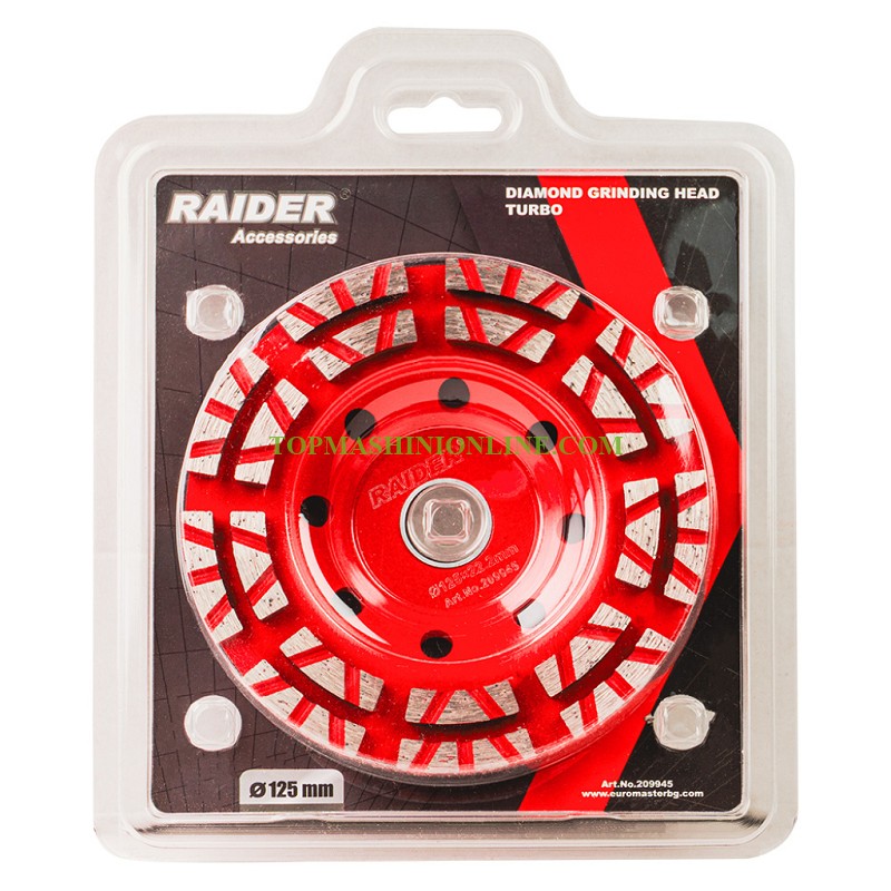 Диск диамантен за шлайфане на бетон Raider 209945 B Turbo с външен диаметър 125 мм, вътрешен диаметър 22.2 мм е подходящ за сухо шлифоване на керамични плочки, мрамор, бетон, зидария, гранит и други строителни материали – както гладки, така и неравни повърхности. B Turbo"- се гарантира стабилна работа върху различни повърхности. Динамичният баланс на сегментите позволява работа без излишни вибрации.