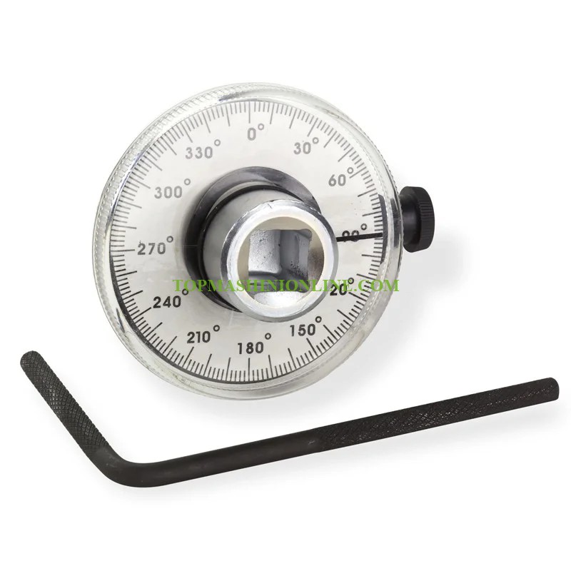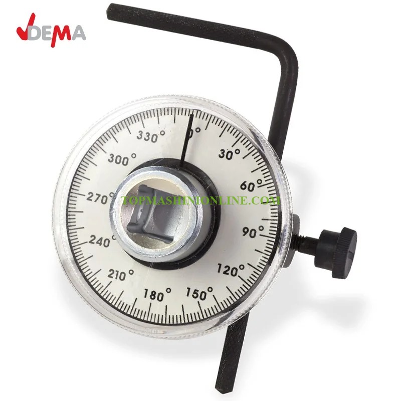 Градусомер Dema 20525 се използва за измерване на ъгъла на въртящия момент при затягане на болтове и гайки с тресчотка или динамометричен ключ 1/2". Тялото е изработено от закалена хром-ванадиева стомана и разполага със скала до 360°, която показва градусите на завъртане.