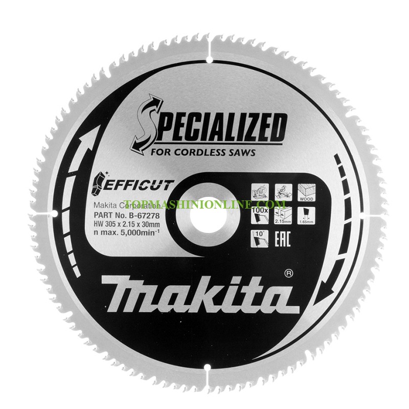 Диск за дърво за циркуляр с карбидни върхове Makita Efficut B-67278 е с външен диаметър 305 мм, вътрешен диаметър 30 мм, 100 зъба с дебелина 2.15 мм. Предназначен е за бързо рязане на дърво с акумулаторни циркуляри. Специално проектираните върхове осигуряват фина повърхност на рязане с минимални усилия, отлично отвеждане на стружките и намалено съпротивление при рязане.