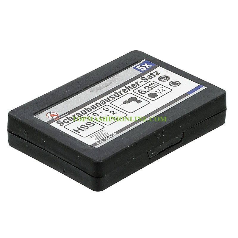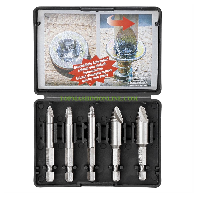 Комплект от 5 броя екстрактори за демонтиране на скъсани болтове BGS 50410 включва 2 екстрактора размер 0 за 6 мм и скорост на пробиване 700-800 об./мин, 1 екстрактор размер 1 за 8 мм и скорост 600-700 об./мин, 1 екстрактор размер 2 за 10 мм и скорост 500-600 об./мин и 1 екстрактор размер 3 за 12 мм и скорост 400-500 об./мин, всички в удобна пластмасова кутия.