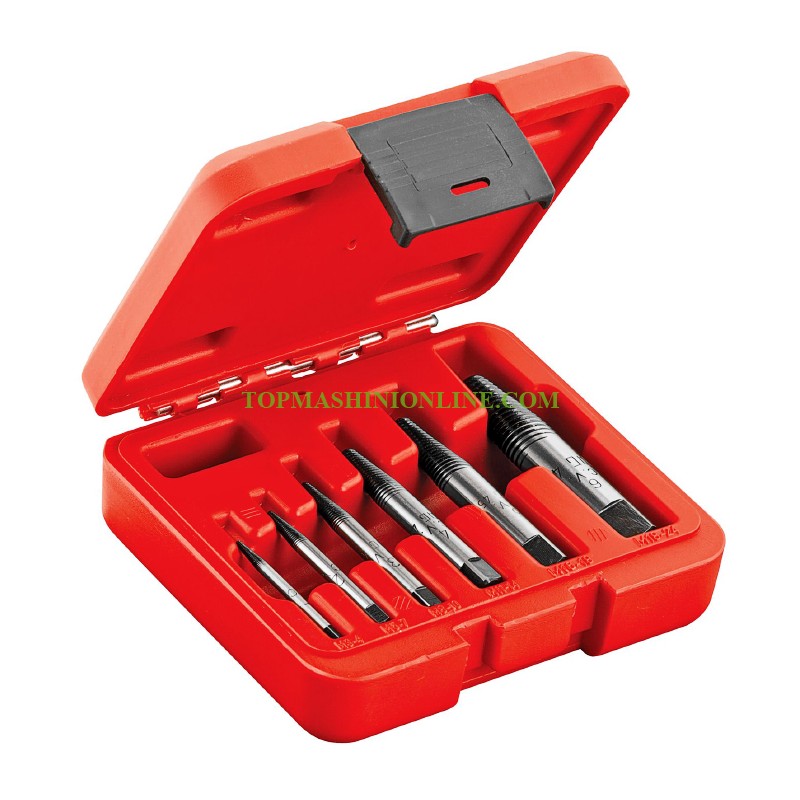 Комплект от 6 броя екстрактори за демонтиране на скъсани болтове Usag 458 S6 се използват за отстраняване на счупени шпилки без повърхност за захващане. Изработени са от специална хром-ванадиева стомана. Те са със сатенено и полирано покритие. Доставят се в пластмасова кутия.