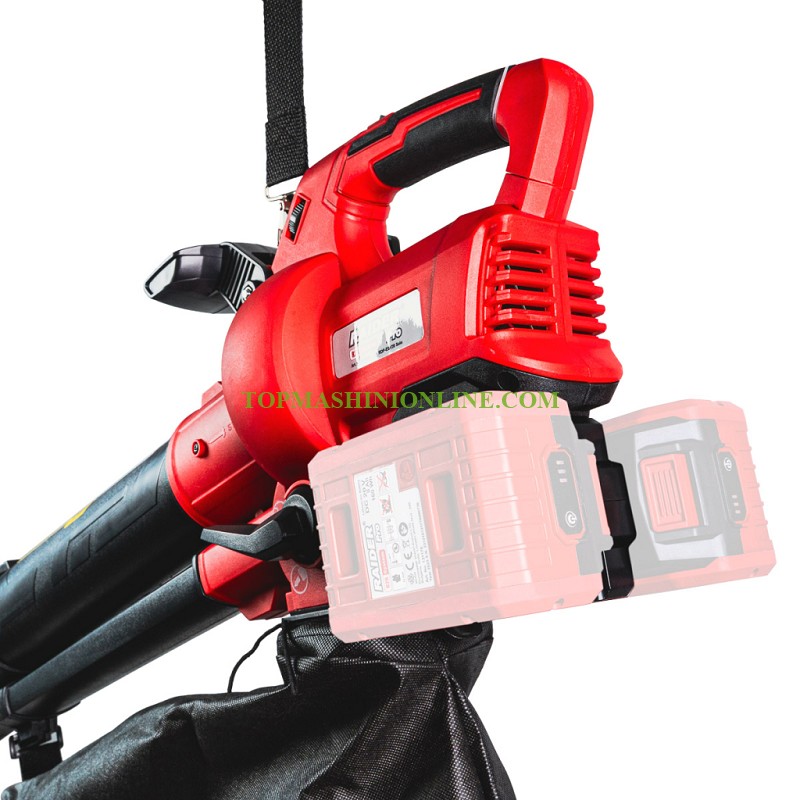 Акумулаторен листосъбирач Raider pro RDP-EBV20 Solo Li-Ion е практично и ефективно решение за почистване на дворове, алеи, градини и други външни пространства. Съчетавайки функции за засмукване и мулчиране, машината предлага висока производителност и удобство при работа, като значително улеснява поддръжката на околната среда. Моделът е в Solo вариант, което означава, че се доставя без батерия и зарядно устройство, като е съвместим с всички батерии от серията R20 (20V). Това позволява гъвкавост и икономия при използване на вече налични батерии. Листосъбирачът работи с номинално напрежение 40V DC (2x20V), което осигурява достатъчно мощност за бързо и ефективно почистване. Благодарение на регулируемите обороти в диапазона 8000–13000 min⁻¹, потребителят може да избере оптималната мощност според конкретната задача – от леки замърсявания до по-тежки условия.