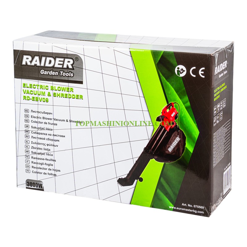 Електрически листосъбирач Raider RD-EBV09 е с мощност 3000 W, регулируеми обороти от 9000 до 15000 мин-¹ което позволява прецизен контрол върху силата на въздушния поток. Листосъбирачът достига максимална скорост на въздуха до 270 km/h, което гарантира бързо и ефективно събиране на листна маса и градински отпадъци. Моделът е оборудван с събирателна торба с капацитет 45 литра, която позволява продължителна работа без често изпразване. Една от ключовите му функции е системата за мулчиране с коефициент 10:1, която раздробява събраните листа и отпадъци, значително намалявайки техния обем. Това улеснява както събирането, така и последващото им използване като компост. Предната част на удължението е оборудвана с гребло, което помага за по-лесно отделяне и събиране на влажни или слепнали листа. Машината е проектирана с мисъл за комфорта на потребителя – нивото на звуково налягане е 84.33 dB, а нивото на вибрации е 3.317 m/s², което осигурява по-стабилна и удобна работа. Със своята функционалност, висока мощност и практичен дизайн, RD-EBV09 е отличен избор за поддръжка на градини и дворове през всички сезони.