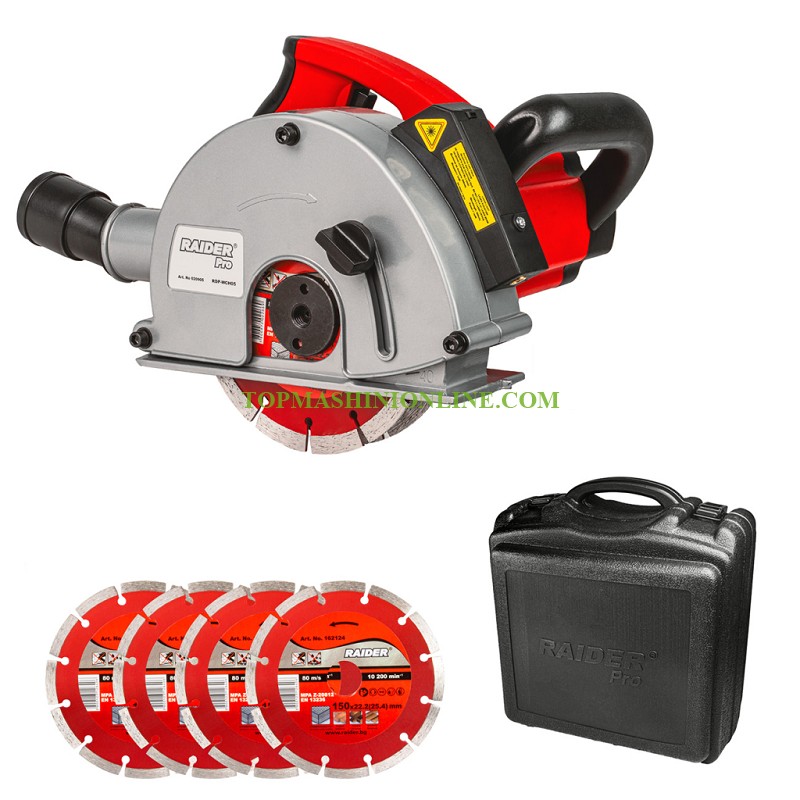 Канална фреза Raider Pro RDP-WCH05 е с мощност 1700 W, външен диаметър на диска 150 мм, вътрешен диаметър на диска 22.2 мм и дълбочина на рязане до 40 мм е проектирана за прецизно и професионално изработване на канали в бетон, тухли, газобетон, камък и други зидарии. Идеален избор е за електроинсталации, ВиК, отоплителни системи и други строително-ремонтни дейности. Настройка на дълбочина на рязане: от 5 мм до 40 мм – позволява оптимален контрол според конкретните нужди. Настройка на широчина на рязане: 14 / 19 / 29 мм. Лазерен водач улеснява праволинейното рязане и повишава точността. Ергономичен дизайн и допълнителна "D" ръкохватка за удобен контрол. Възможност за свързване към прахосмукачка – за по-чисто и безопасно работно място. Доставя се в комплект с 4 диска и здрав куфар=