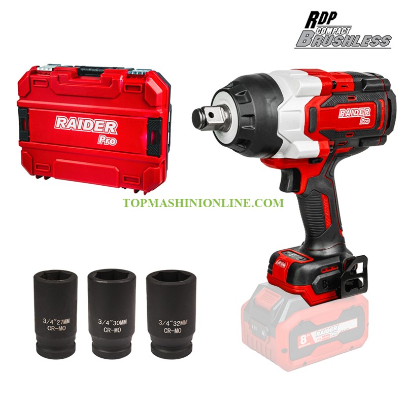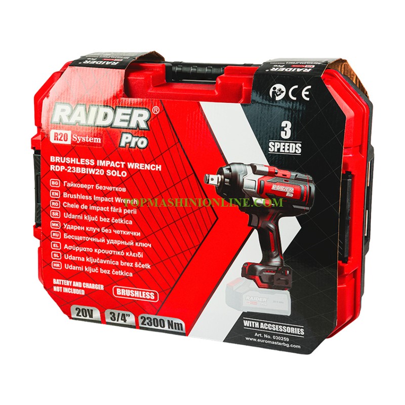 Акумулаторен безчетков гайковерт Raider pro RDP-23BBIW20 Solo 20 V Li-ion, със захват 3/4"е най-мощният акумулаторен гайковерт в категорията Raider pro R20 Pro, създаден за професионална употреба при екстремни натоварвания. Инструментът е проектиран за интензивна работа в сервизи, строителството, индустрията и поддръжката на тежка техника. Оборудван е с високоефективен безчетков мотор (Brushless), който осигурява значително по-дълъг експлоатационен живот, по-ниско загряване и по-ефективно използване на батерията. С максимален въртящ момент от 2300 Nm, гайковертът безпроблемно се справя със силно затегнати, ръждясали и натоварени болтове и гайки.С захват 3/4" квадрат и пълна съвместимост с всички батерии от R20 System, моделът предлага отличен баланс между мощност, мобилност и цена. Доставя без батерия и зарядно, което го прави идеален избор за потребители, които вече разполагат с R20 платформа.