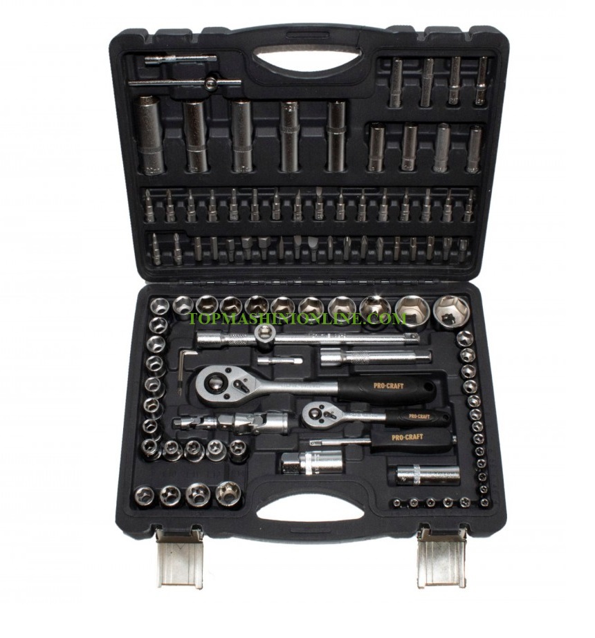 Комплект гедоре 108 части Procraft WS-108 включва 2 тресчотки 1/2", 1/4", вложки, битове, кардани, удължители и гаечни ключове, които се доставят в пластмасов куфар