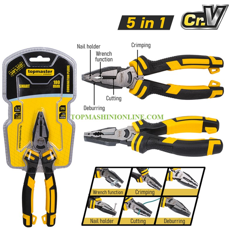 Клещи комбинирани с дължина 180 мм Top Master Pro 210185 са предназначени за захващане, огъване и рязане на проводници, кабели и други материали. Те съчетават функциите на дългоустите клещи и резачките в един универсален инструмент, което ги прави отличен избор както за професионалисти, така и за домашни майстори. Изработени са от висококачествена Cr-V (хром-ванадиева) стомана, която осигурява висока здравина, устойчивост на износване и дълъг експлоатационен живот. Клещите са закалени до твърдост 55–65 HRC, гарантираща надеждност и устойчивост на деформации при интензивна употреба. Специалната конструкция с 30% по-голям лостов ефект позволява постигане на по-голяма сила с по-малко усилие, като значително намалява умората при продължителна работа. Ергономичните TRP дръжки осигуряват стабилен, удобен и противохлъзгащ захват, допринасяйки за по-добър контрол и безопасност по време на работа. Челюстите позволяват прецизно захващане и огъване, а вградените резачки осигуряват чисто и ефективно рязане.