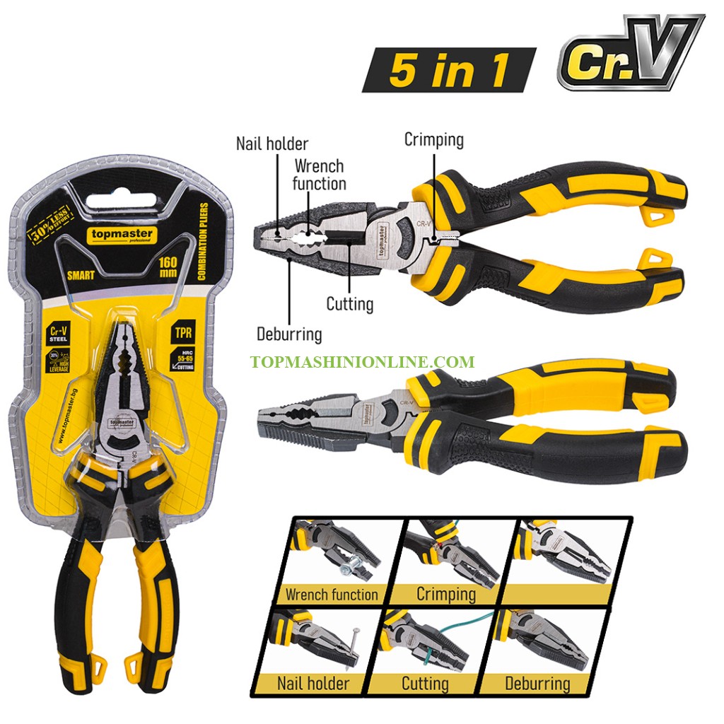 Клещи комбинирани с дължина 160 мм Top Master Pro 210184 са предназначени за захващане, огъване и рязане на проводници, кабели и други материали. Те съчетават функциите на дългоустите клещи и резачките в един универсален инструмент, което ги прави отличен избор както за професионалисти, така и за домашни майстори. Изработени са от висококачествена Cr-V (хром-ванадиева) стомана, която осигурява висока здравина, устойчивост на износване и дълъг експлоатационен живот. Клещите са закалени до твърдост 55–65 HRC, гарантираща надеждност и устойчивост на деформации при интензивна употреба. Специалната конструкция с 30% по-голям лостов ефект позволява постигане на по-голяма сила с по-малко усилие, като значително намалява умората при продължителна работа. Ергономичните TRP дръжки осигуряват стабилен, удобен и противохлъзгащ захват, допринасяйки за по-добър контрол и безопасност по време на работа. Челюстите позволяват прецизно захващане и огъване, а вградените резачки осигуряват чисто и ефективно рязане.