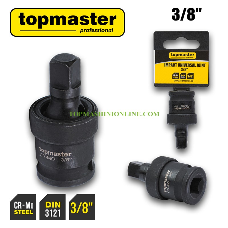 Кардан ударен 3/8" Top Master Pro 330673 е компактен и надежден инструмент, предназначен за работа в ограничени пространства, където стандартните удължители не осигуряват достатъчна гъвкавост. Благодарение на подвижната си връзка, карданът позволява работа под различни ъгли, без компромис със стабилността и контрола. Изработен е от висококачествена хром-молибденова стомана (Cr-Mo) и закален по стандарт DIN 3121, този кардан осигурява отлична устойчивост на ударни натоварвания, износване и деформации. Подходящ е както за ударни гайковерти, така и за ръчни инструменти, използвани в сервизни, монтажни и ремонтни дейности.