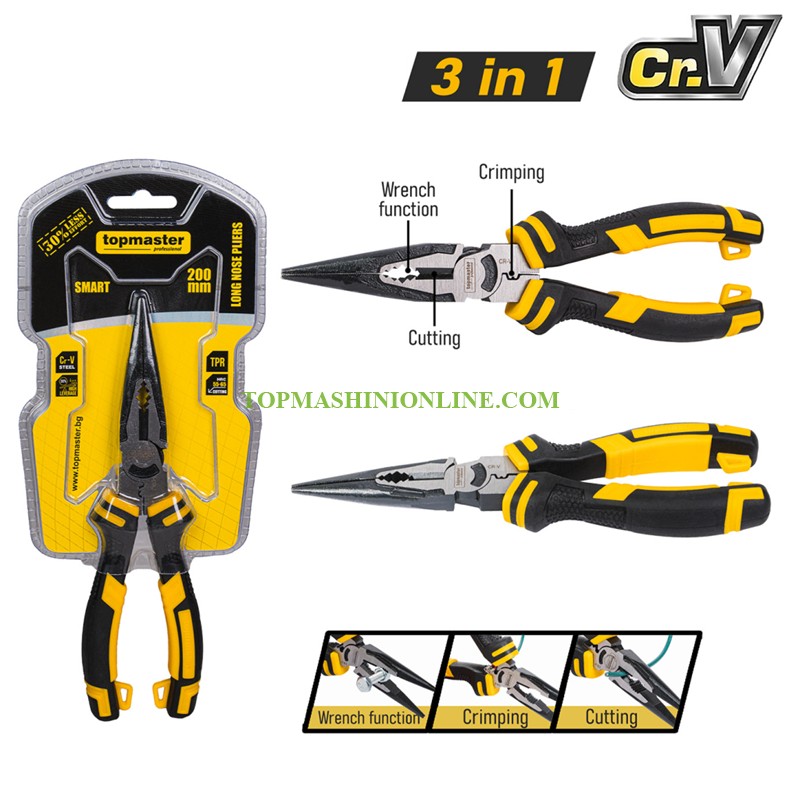 Дългоусти клещи с дължина 200 мм Top Master Pro 210181 са изработени от висококачествена Cr-V (хром-ванадиева) стомана, която осигурява отлична здравина, устойчивост на износване и дълготрайна надеждност при интензивна употреба. Клещите преминават през процес на закаляване с твърдост 55–65 HRC, което гарантира висока издръжливост и устойчивост на деформации. Специалната конструкция с 30% по-голям лостов ефект позволява постигане на по-голяма сила на захващане при значително по-малко усилие от страна на потребителя. Това прави работата по-ефективна и намалява умората при продължителна употреба. Ергономичните TRP дръжки осигуряват сигурен и удобен захват, предотвратяват приплъзване и допринасят за по-добър контрол по време на работа. Дългите и тънки челюсти позволяват прецизно захващане, огъване и позициониране на малки детайли, проводници и елементи.