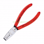 Клещи кербовъчни за изолирани кабелни обувки Knipex 145 мм. За кримпване на кабелни накрайници съгласно стандарта DIN 46228 части 1 + 4 в диапазон от 0.25 до 2.5 кв.мм. Кримпване в маркирани трапецовидни профили за надеждни съединения между контактната втулка и кабела. Хром-ванадиева стомана, маслено закалена.