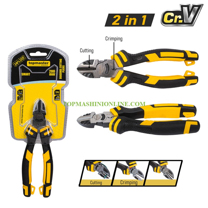 Клещи резачки с дължина 200 мм Top Master Pro 210183 са предназначени за ефективно рязане на проводници, кабели и други материали при монтажни и ремонтни дейности. Благодарение на по-голямата си дължина те осигуряват по-добър достъп и по-голям контрол, което ги прави отличен избор както за професионалисти, така и за домашни майстори. Инструментът е изработен от висококачествена Cr-V (хром-ванадиева) стомана, осигуряваща висока здравина, устойчивост на износване и дълъг експлоатационен живот. Клещите са закалени до твърдост 55–65 HRC, което гарантира надеждност и устойчивост на деформации при интензивна употреба.