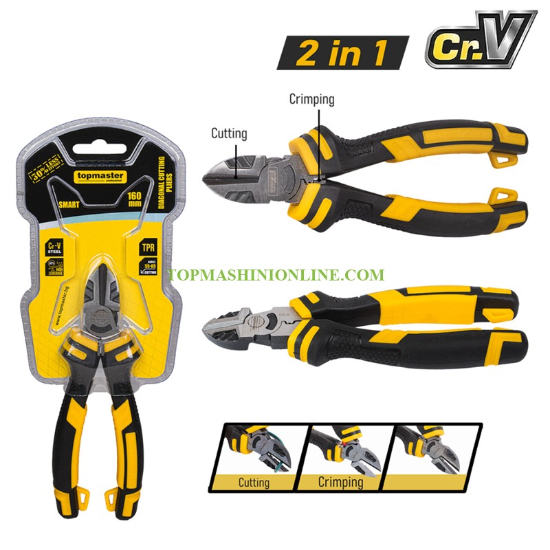 Клещи резачки с дължина 160 мм Top Master Pro 210182 са предназначени за ефективно рязане на проводници, кабели и други материали при монтажни и ремонтни дейности. Благодарение на по-голямата си дължина те осигуряват по-добър достъп и по-голям контрол, което ги прави отличен избор както за професионалисти, така и за домашни майстори. Инструментът е изработен от висококачествена Cr-V (хром-ванадиева) стомана, осигуряваща висока здравина, устойчивост на износване и дълъг експлоатационен живот. Клещите са закалени до твърдост 55–65 HRC, което гарантира надеждност и устойчивост на деформации при интензивна употреба.