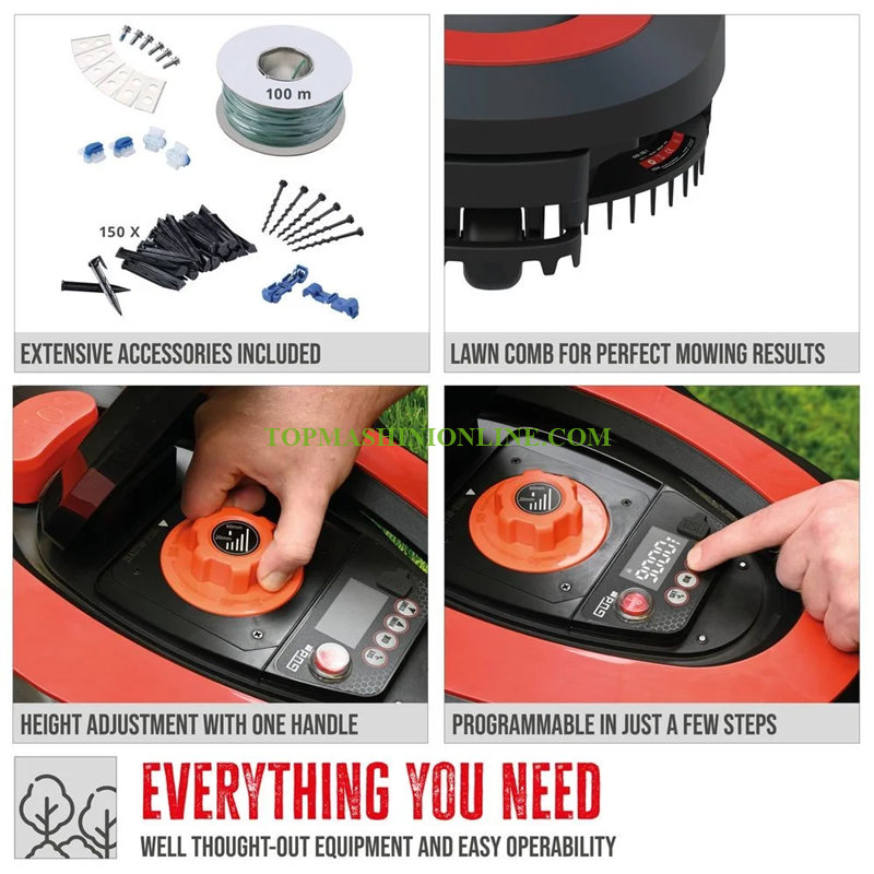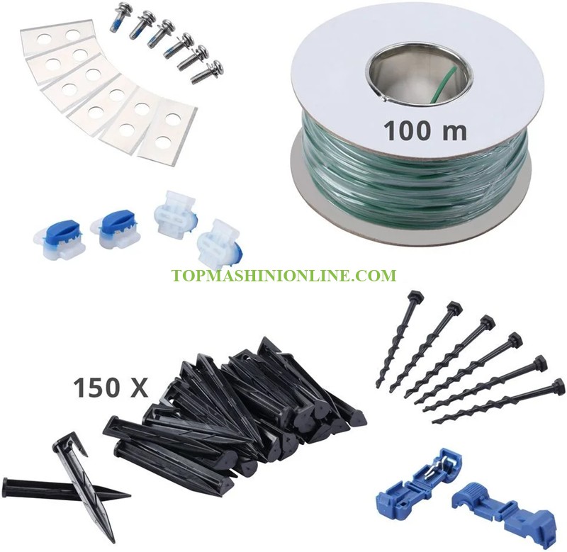 Роботизирана косачка за трева Güde GRR 180.1, зарядна станция със свързващ кабел, 6 заземителни винта за зарядната станция, 100 м граничен кабел, 150 заземителни колчета с куки за граничен кабел, 4 кабелни конектора, 6 резервни ножа, 2 адаптерни щепсела.