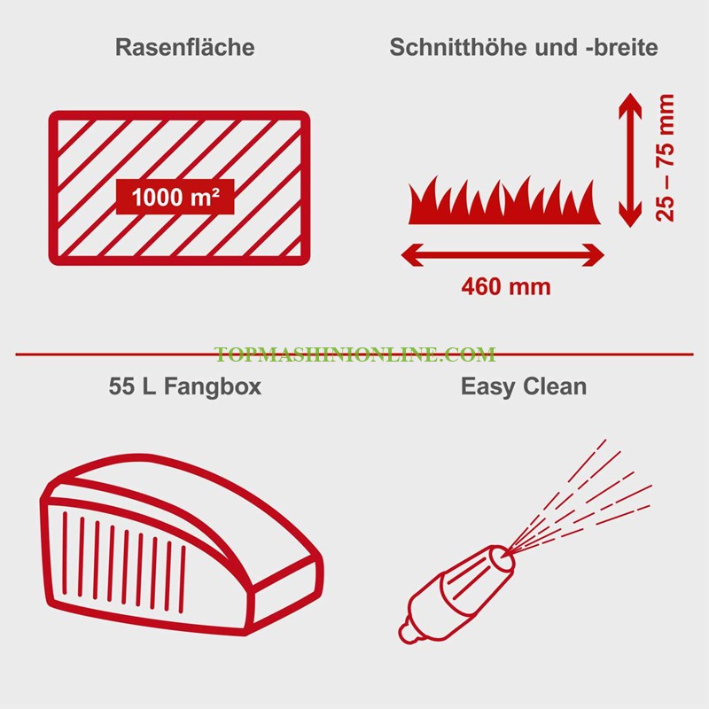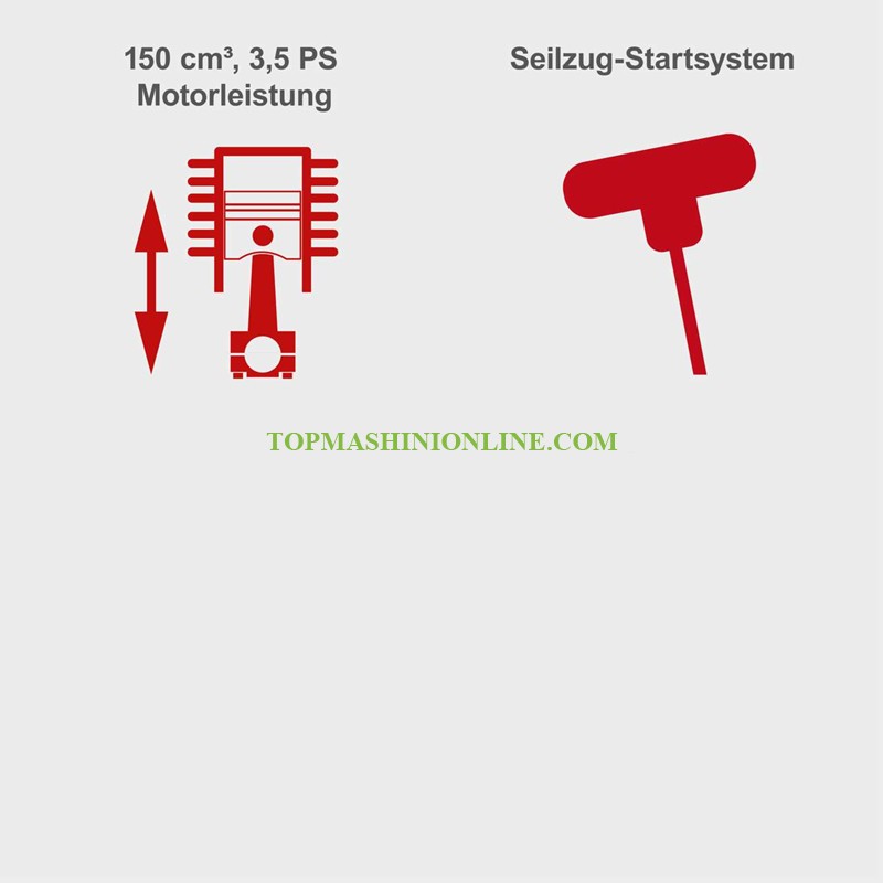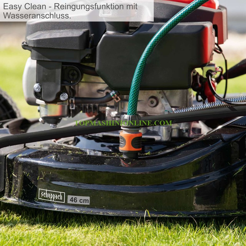 Моторна косачка за трева с кош 55 литра Scheppach MP150-46 е с 4-тактов бензинов двигател с мощност 3,5 к.с.с ръчен стартер, който осигурява на косачката необходимата мощност за надеждно косене дори на дълга и мокра трева. Здравият текстилен кош за трева побира 55 литра окосена трева. Страничното изхвърляне и функцията за мулчиране правят тази косачка универсален инструмент. Сгъваема дръжка за лесно и компактно съхранение или транспорт. Централно регулиране на височината на косене в 7 степени (25 – 75 мм).