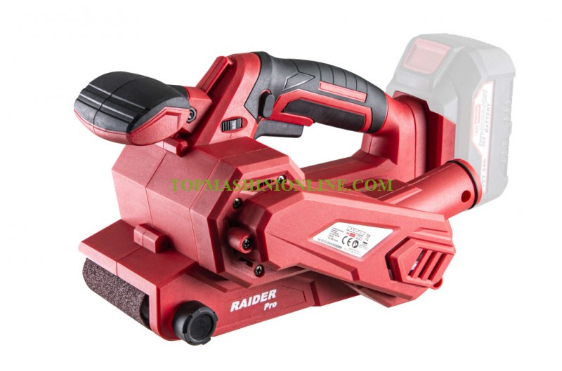 Акумулаторна лентова шлайф машина Raider Pro RDP-SBS20 20 V с размер на лента 76х457 мм и скорост на лентата 2-6.3 м/с е с мощен двигател, който осигурява максимална производителност, 6-степенно регулиране на оборотите в диапазона от 120-380 мин-¹. Оборудван е с допълнителната регулируема ръкохватка, осигуряваща удобно боравене и позволява прецизно водене на машината и лостов механизъм за бързо освобождаване и смяна на работната лента.