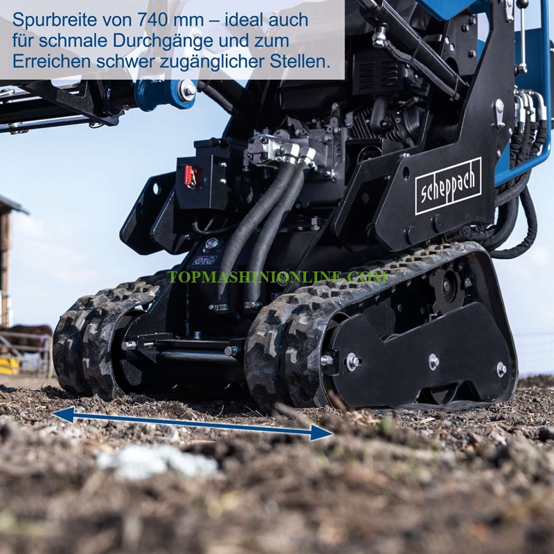 Компактен мини челен товарач Scheppach MKL730 е с максимална товароносимост от 200 кг, е мощен универсален уред за широк спектър от задачи в градината, двора или строителната площадка. Оборудван с мощен 4-тактов бензинов двигател с мощност 8,5 к.с. / 6,3 kW и работен обем 306 см³ и прецизна хидравлика, той позволява точна работа дори в взискателни условия. В зависимост от прикачения инструмент, компактният товарач е подходящ за пробиване на дупки, товарене на палети, работа по изравняване и бутане, или товарене на пясък, почва или дървесина. Верижните греди с ширина 180 мм осигуряват максимална стабилност, дори върху неравен терен. Благодарение на компактния си дизайн и ширина на веригите само 740 мм, MKL730 може да преминава през тесни проходи и лесно да достига дори до труднодостъпни места.