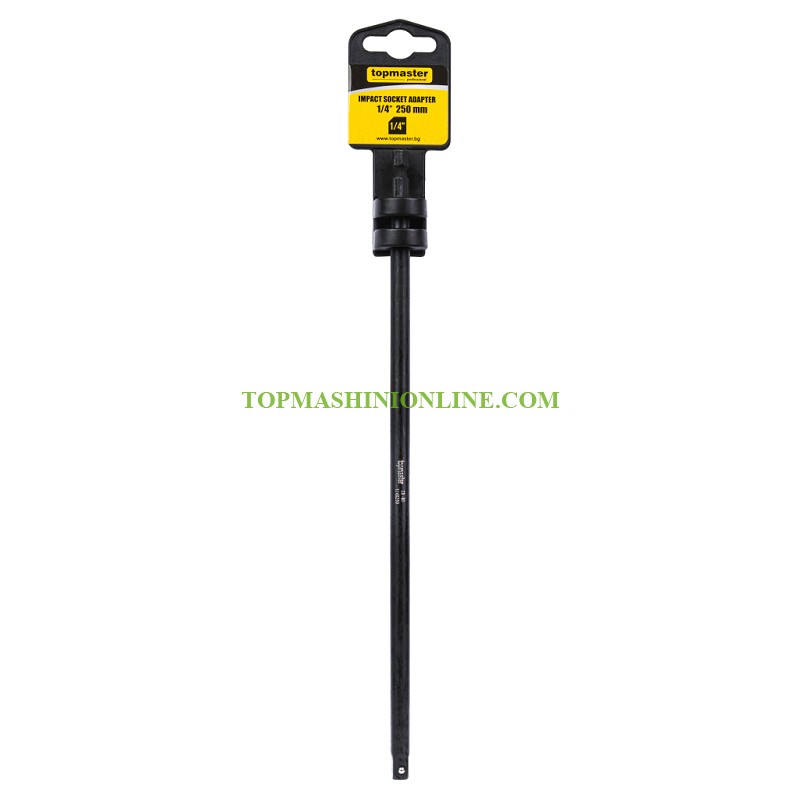 Удължен ударен адаптер Top Master Pro 330723 е създаден за работа в труднодостъпни места, където е необходим допълнителен обхват. Изработен е от здрава и устойчива хром-молибденова стомана (Cr-Mo) осигуряваща надеждност дори при високи натоварвания, а дължината от 250 мм позволява лесен достъп до винтове и гайки в дълбочина. Подходящ е за стандартни 1/4" вложки.