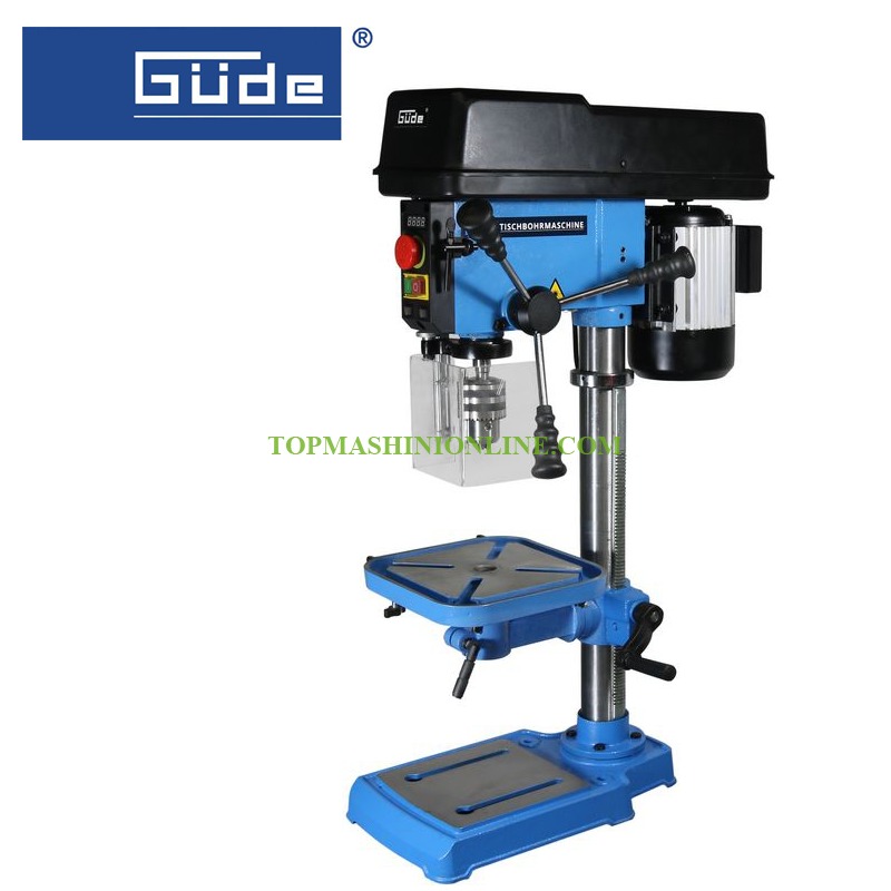 Настолна бормашина GÜDE GTB16/500 VARIO с мощност 500 W е с дигитален дисплей, лазерно позициониране, LED работно осветление, патронник B16, регулируема височина и наклон на пробиване +/- 45°, 360° шарнирно съединение и шпиндел с лагерно окачване. Регулируем дълбочинен стопер за прецизно пробиване. Макс. дистанция от патронника до работната плоча: 245 мм.Макс. дистанция от патронника до основата: 420 мм. Размер на основата 410 x 245 мм с възможност за закрепване на менгеме.
