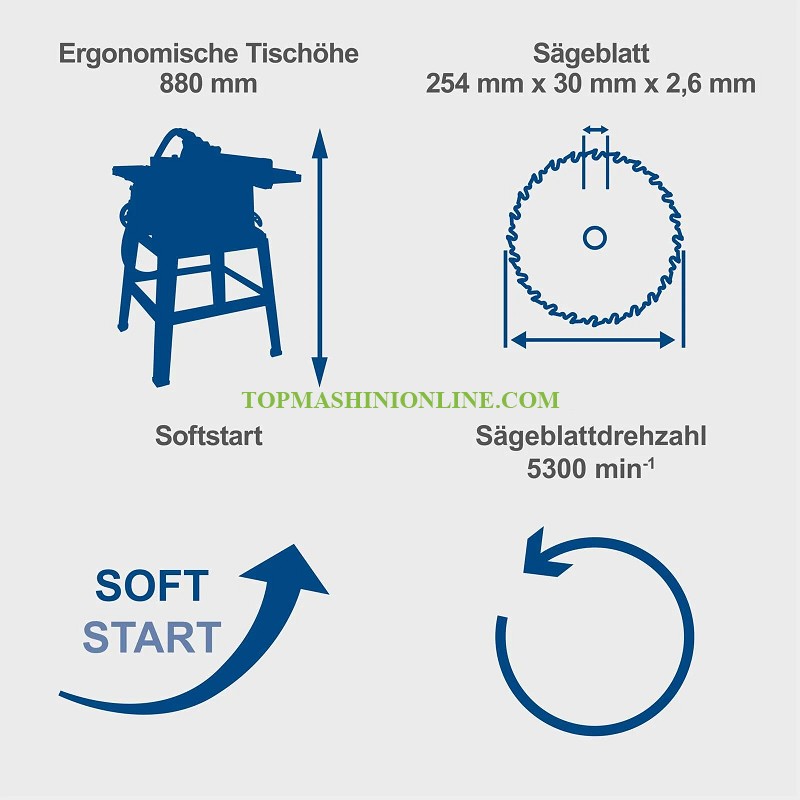 Стационарен циркуляр Scheppach HS254 е подходящ за прецизно рязане на греди, профилирани дъски, както и за надлъжно и ъглово рязане. Мощният 2200-ватов мотор и циркулярният диск с диаметър 254 мм със скорост от 5300 об/мин осигуряват бърз напредък и прецизни разрези. Здравата основа, изработена от масивна листова стомана, позволява ергономична работна стойка и осигурява стабилност. Удълженията на масата от двете страни също позволяват обработката на големи детайли. Циркуляра е с височина на рязане при 90° - 85 мм, а при 45°-63 мм, която може да се регулира чрез ръчно колело, интегрирана връзка за изсмукване, бзстепенно регулируем нож на триона от 0 до 45° за прецизни рязане под ъгъл, регулируем водач за напречно рязане от -60° до +60° – идеален за рязане под ъгъл и надлъжен ограничител и вградена скала за прецизни разрези.