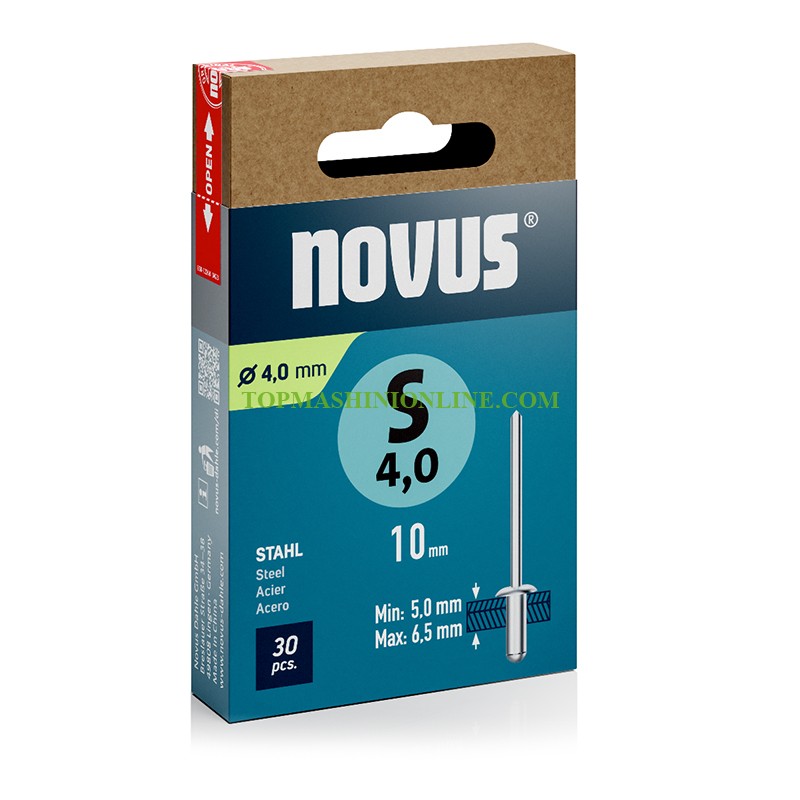 Стоманени попнитове Novus 045-0103 тип S4 са със стандартна периферия, диаметър 4 мм и дължина 10 мм и са подходящи за материали с дебелина 6,5–9 мм и 5–6,5 мм. Доставят се в опаковка от 30 броя.