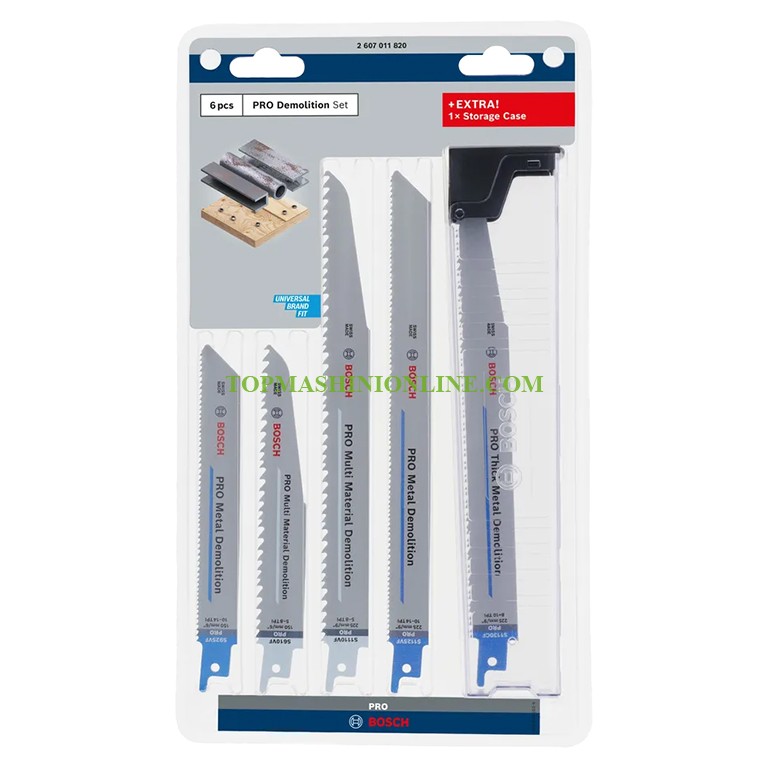 Комплект от 6 ножа за саблен трион Bosch PRO Demolition с универсален захват, предназначени за различни задачи по разрушаване. Здравината им се дължи на биметалната конструкция, съчетаваща дебело, но гъвкаво тяло от HCS стомана със закалени твърди HSS зъби с геометрия 2х2 и Vario конструкция за бързо и гладко рязане. В комплекта са включени 6 ножа - два PRO Metal Demolition S925VF и по един PRO Multi Material Demolition S610VF, PRO Multi Material Demolition S1110VF, PRO Metal Demolition S1125VF и PRO Thick Metal Demolition S1130CF.