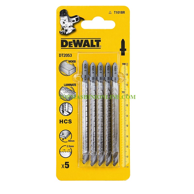 5 броя ножа за зеге с Т-образен захват DeWALT DT2053-QZ с работна дължина 73 мм и обща дължина 100 мм са изработени от високовъглеродна стомана. С обратни зъби, те са предназначени за праволинейно рязане на меки материали като дърво, ламинат, шперплат, ПДЧ и пластмаса.