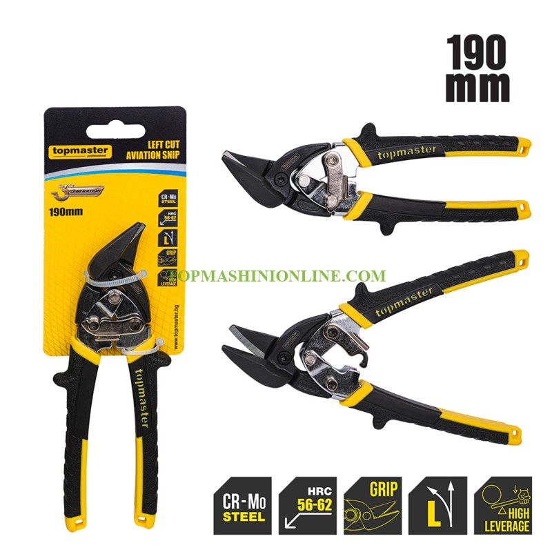 Ножица за рязане на ламарина лява с дължина 190 мм Top Master Pro 370723 е предназначена за прецизно и ефективно рязане при интензивна употреба. С дължина 190 мм, тя е специално проектирана за криволинейни разрези вляво, изрязване на контури, отвори и различни форми, като осигурява отлична видимост на линията на рязане и стабилен контрол. Инструментът е изработен от висококачествена хром-молибденова стомана, гарантираща висока здравина и дълъг експлоатационен живот. Остриетата са закалени до 56–62 HRC, което осигурява отлична износоустойчивост и дълготрайна острота дори при продължителна и натоварена работа. Благодарение на конструкцията с голям лостов ефект, ножицата осигурява по-голяма режеща сила с по-малко усилие, което значително намалява умората при работа и повишава производителността. Подобреният захват на ламарината предотвратява приплъзване по време на рязане и гарантира по-висока точност и безопасност.