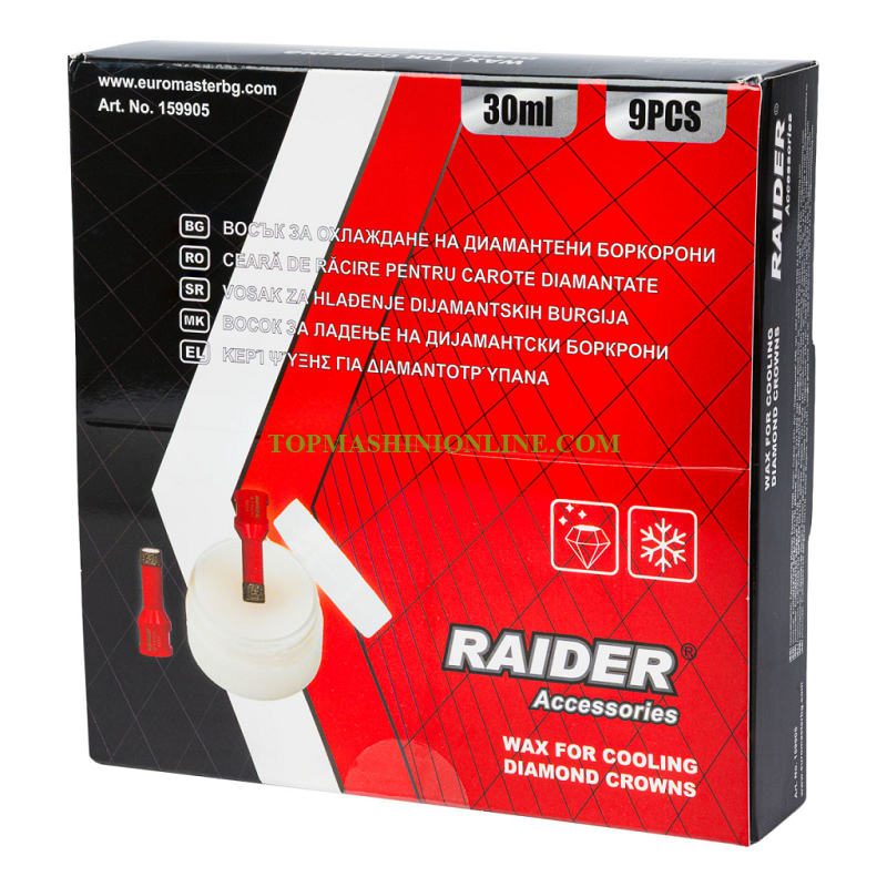 Комплектът восък за охлаждане на диамантени боркорони Raider 159905 включва 9 броя специализирани восъчни пълнители, разработени за използване при сухо пробиване. Те играят ключова роля за намаляване на температурата по време на работа, като по този начин предпазват диамантеното покритие от прегряване и преждевременно износване. Восъкът се активира при контакт с работната повърхност и триенето по време на пробиване, като осигурява допълнително охлаждане и смазване. Това води до по-гладък процес на пробиване, по-малко натоварване върху инструмента и по-висока ефективност. Особено подходящ при работа с твърди материали като гранит, гранитогрес, керамика и стъкло, където контролът на температурата е от съществено значение. Комплектът е практично решение както за професионалисти, така и за любители, които искат да удължат живота на своите диамантени боркорони и да постигнат по-добри резултати.