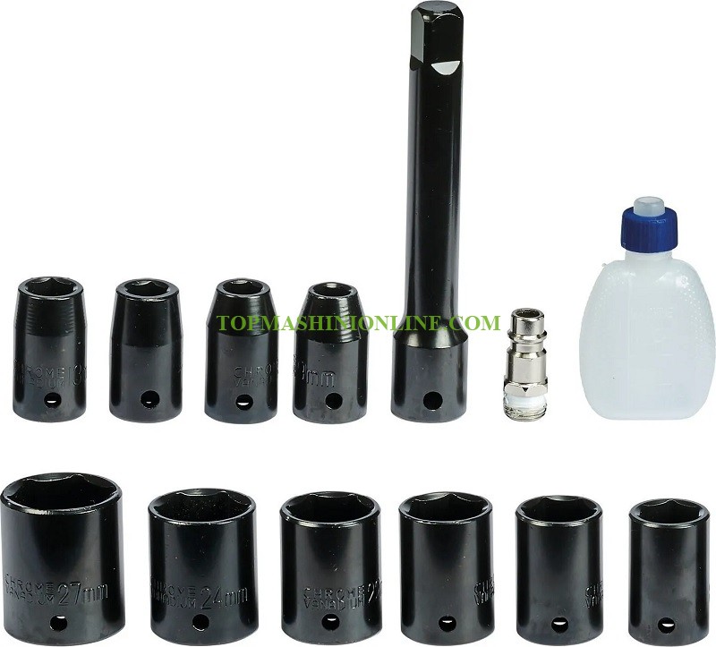Пневматичен гайковерт Einhell TC-PW 610 с максимален въртящ момент 610 Nm. С нехлъзгаща гумирана дръжка. С три степени на завинтване и една за развиване. Доставя се в комплект с 10 бр. вложки с размери 8/10/11/13/17/19/21/22/24/27 мм, малка бутилка масло, удължител 125 мм и нипел.