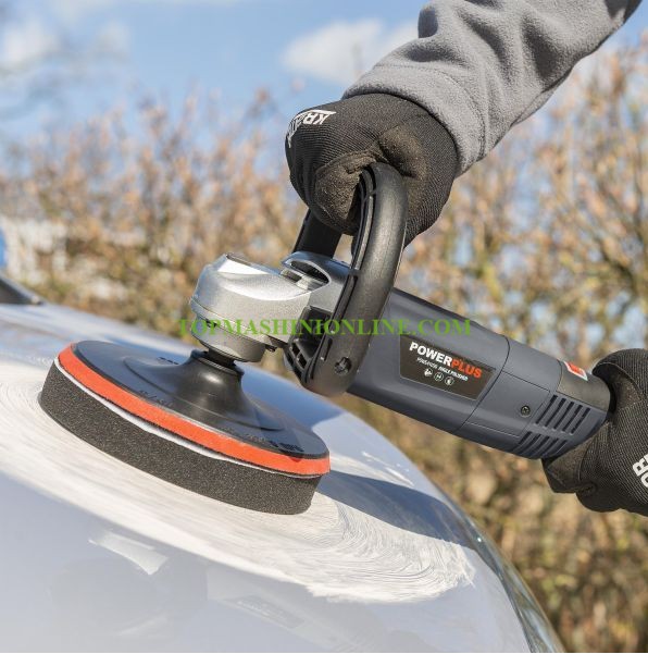 Електрическа машина за полиране Power PlusPOWE41030 с мощност 1200 W и диаметър на диска 180 мм е с корпус от устойчивапластмаса. Формата на инструмента се стеснява до задната ръкохватка за удобно захващане с една ръка. За допълнителен контрол върху машината за полиране в комплекта има допълнителна дръжка. Предната дръжка е под формата на дъга, която ви позволява да я държите навсякъде и машината да бъде наклонена така, както е удобно за оператора. Плавният старт ви гарантира, че скоростта се увеличава с постоянен темп, докато се достигне желаната скорост на въртене. Това предотвратява резките движения, докато полирате колата си. Освен това можете сами да изберете скоростта на въртене, в зависимост от материала, върху който трябва да работите.
