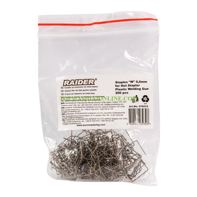 Скоби за поялник за пластмаса 200 броя Raider 076215 са специализирани консумативи, предназначени за ремонт и подсилване на пластмасови елементи, като като брони, панели, резервоари, пластмасови компоненти и други. Подходящи за работа с поялници за пластмаса, работещи на температури до 700°C.