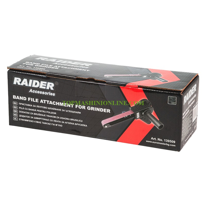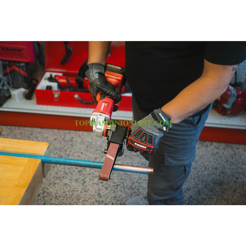 Приставка за лентово пилене за ъглошлайф Raider 139510 е високоефективно решение, което трансформира стандартния Ви ъглошлайф в практичен и многофункционален лентов шлайф. Създадена за професионална и полупрофесионална употреба, тя осигурява прецизно шлайфане, заглаждане, оформяне и заточване на различни материали – метал, дърво, пластмаса и други технически повърхности. Идеална за широк спектър от задачи: премахване на ръжда, оформяне на ръбове, зачистващи операции, фино шлайфане, заточване на инструменти. Благодарение на компактния си дизайн и широката съвместимост с ъглошлайфи мм Ø115 и Ø125 мм, приставката позволява работа в труднодостъпни зони, където стандартните шлайфове не могат да достигнат.