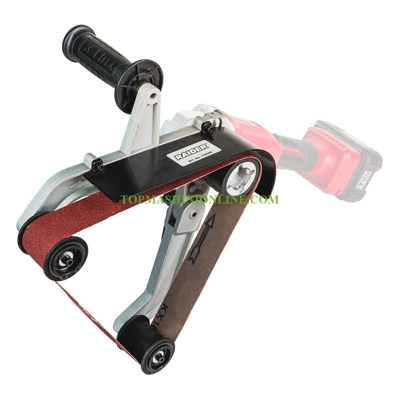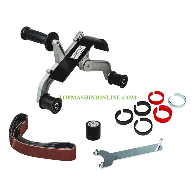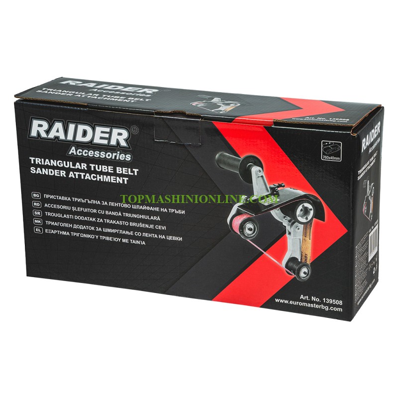 Приставка триъгълна за лентово шлайфане на тръби Raider 139510 трансформира стандартния ъглошлайф Ø125 mm в професионален лентов шлайф, специално създаден за обработка на метални тръби и конструктивни елементи. Подходяща е за шлайфане, зачистване и полиране на неръждаема стомана, черни метали, парапети, рамки и конструкционни тръби. Подходяща е за разнообразни материали като: инокс, парапети, перила, рамки, конструкции и тръби. Осигурява бързо и ефективно почистване на заварки по тръбни конструкции, както и равномерно шлайфане по по-голяма част от обиколката. Регулирането на ъгъла и натиска предоставя прецизно и контролирано шлайфане.