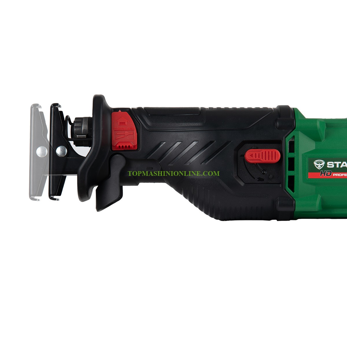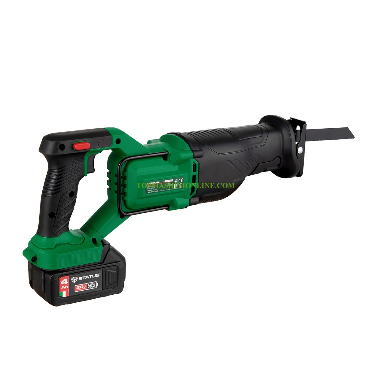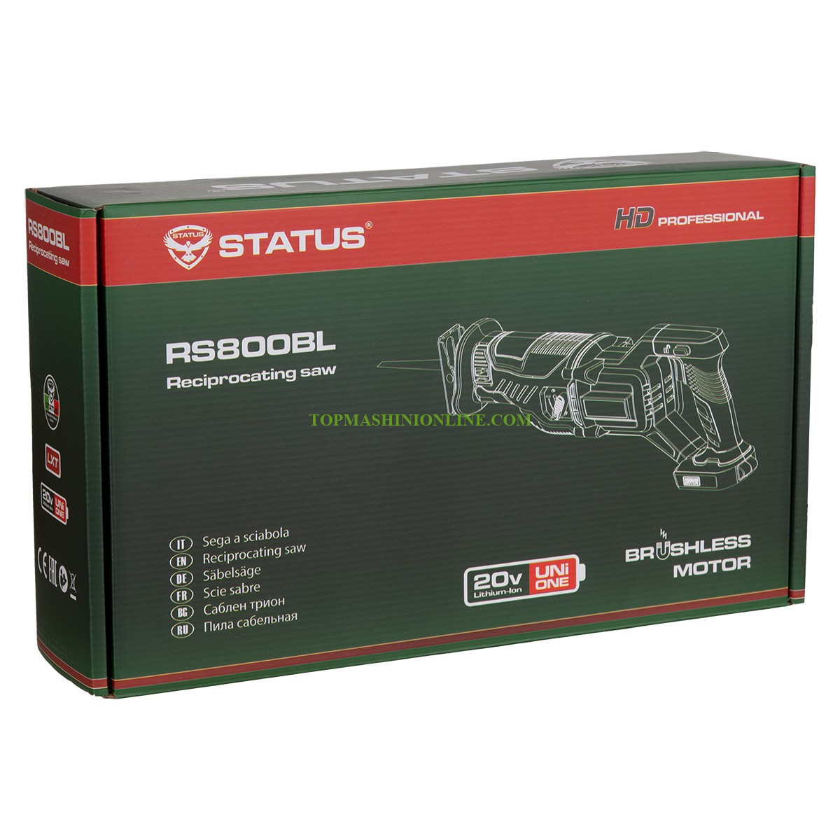 Акумулаторен саблен трион с безчетков мотор Status RS800BL 20 V, 4.0 Ah, Li-ion е с вградено осветление на зоната за рязане. Система за бърза смяна на ножовете, гумирана предна и задна дръжка. Регулиране на честотата на двойните ходове чрез степента на натиск върху превключвателя.