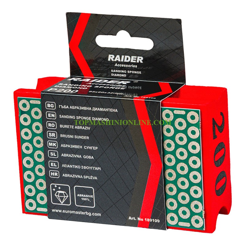 Гъба за шлайфане Р200 Raider 189109 с размери 95x60x32 мм е създадена за висококачествена ръчна обработка на твърди материали като: гранит, мрамор, керамика, гранитогрес, бетон и технически камък. Бързо коригира ръбове и премахва груби неравности. Подходяща при сериозни дефекти и силно издадени ръбове. Подходяща е за сухо и мокро шлайфане. Абразива P200 осигурява фино шлайфане. Премахва микро-драскотини и изравнява повърхността. Оставя матов, равномерен финиш. Идеална преди финална обработка или преход към по-фини инструменти.