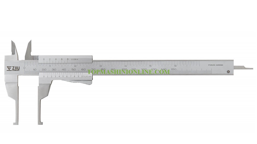 Двустранен шублер за вътрешни канали ZIIU Standart 0166 4 8020 11 с диапазон на измерване 20-200 мм, челюсти 50 мм и точност на измерване 0.05 мм/м е закален, изработен от неръждаема стомана с хромирани скали, плосък дълбокомер и ергономичен стопорен палец. Нониус 1/20 мм; 1/128 in. Опакован в кожен калъф. Използва се за измерване на разстоянието между две противоположни страни на даден предмет. Върховете на шублера се нагласяват така, че да съвпаднат с противоположните точки, след което шублерът се отстранява и разстоянието между върховете се измерва с инструмент за измерване, например линия.