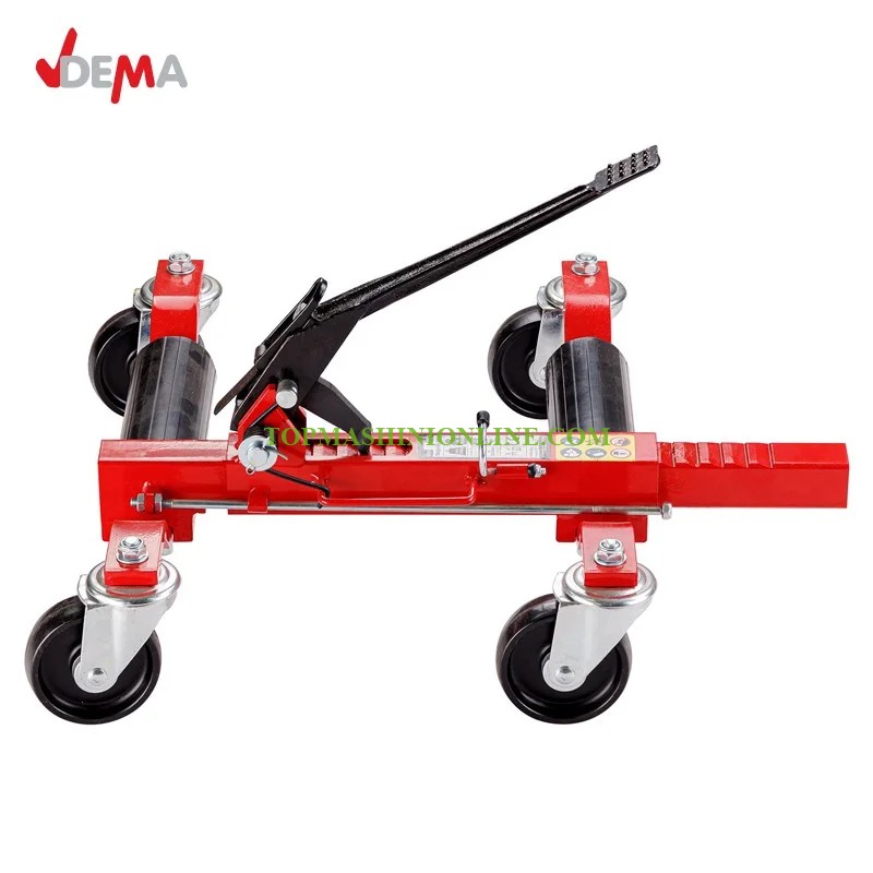 Количка за преместване и позициониране на коли Dema DRH 9 е оборудвана с лесен за поддръжка люлеещ се механизъм без хидравличен цилиндър, което намалява риска от изтичане на масло. Педалът е постоянно монтиран и позволява повдигането и спускането на маневреното устройство само чрез завъртане на лоста за превключване. Количката има четири здрави въртящи се колела със сачмени лагери и PVC защитни ролки, които позволяват повдигане, маневриране и спускане, щадящи гумите. Предлагат се и удобна дръжка за носене и педал с кука за задържане за пестене на място. Доставя се напълно сглобена, с изключение на двете напречни греди, които трябва да се монтират с 8 винта.