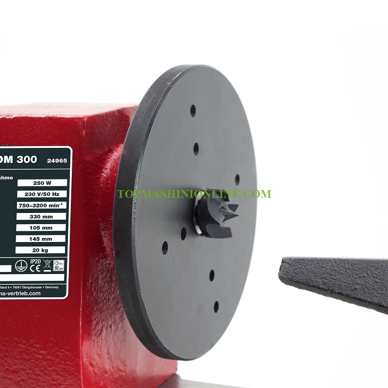 Дърводелски струг Dema DM 300 с мощност 250 W е с безстепенно регулируеми обороти чрез потенциометър от 750-3200 мин-¹ , централно разстояние 330 мм и височина на центъра 105 мм, опора за ръка със скоба от солидно лято желязо, регулируем въртящ център, лицева плоча с възможност за монтаж на допълнителни инструменти, защита от претоварване и инструменти за сглобяване. Легло на струга е изработено от солидно лято желязо.