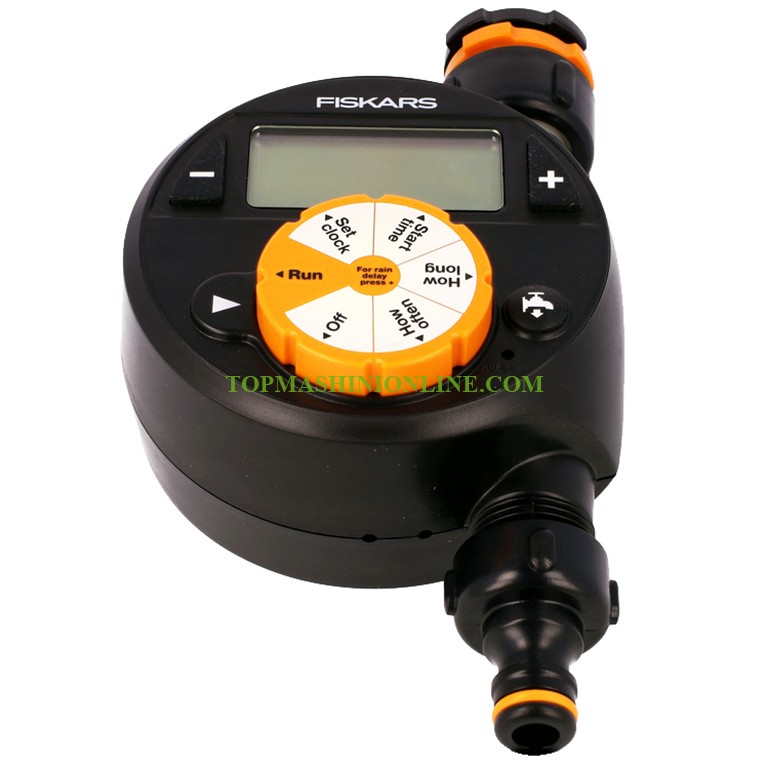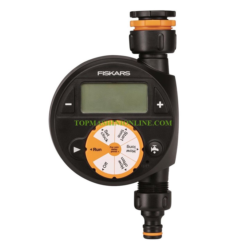 Електронен таймер-програматор за вода Fiskars FS 1054791 е лесен за настройка и използване и автоматично стартира и спира поливането според зададения график. С клапата за включване/изключване поливането може да започне веднага, без да се променят настройките, а когато зарядът на батериите е нисък, поливането ще спре автоматично. Конекторът за кран с таймер има три размера на резбата - 1/2", 3/4" и 1", и пасва на повечето обикновени кранове. Големият и лесен за четене LCD дисплей позволява лесно настройване. На него може да се зададат времето за начало и край на поливането, поливане на интервали от 6 ч, 12 ч или 1-7 дни) и продължителността на поливане - от 1 до 360 мин. Въртящият се конектор помага при монтажа, а вграденият воден филтър осигурява дълъг живот на таймера. Работи с две АА батерии (продават се отделно). Налягане 0.5-12 bar, максимална температура на водата 60°C.