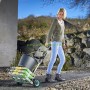 Сгъваема транспортна количка с бандажни колела Wolfcraft TS 850 Offroad с товароносимост 100 кг (макс. 50 кг на стъпала) е оборудвана с устойчиви на пробиване бандажни колела с широк профил и диаметър 18 см - идеални за използване на стъпала и на практически всички външни терени. Солидната платформа от лят алуминий с размери 490x280 мм и 3-точковото фиксиране с множество опции за монтаж осигуряват здраво закрепване и транспортиране на товара във всяка ситуация и на всякакъв терен. Двете извити задни подпори поддържат оптимално кръгли предмети, а здравата напречна греда улеснява накланянето на количката. Закръглената гумирана ръкохватка с практичен бутон за централно заключване може да се издърпа до 110 см и осигурява достатъчно свободно пространство при транспортиране на високи, обемисти предмети. В сгънато положениеTS 850 Offroad е с размери 500x820x77 мм.